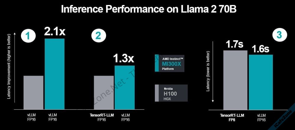 AMD จึงบอกว่าอย่ากระนั้นเลย ตัวเลขที่โชว์บนเวทีเป็นการวัดผลตั้งแต่เดือนพฤศจิกายน และออกตัวเลขใหม่ที่ใช้ซอฟต์แวร์ ROCm เวอร์ชันใหม่ ปรับปรุงประสิทธิภาพให้ดีกว่าเดิม ผลคือ AMD ชนะขาดกว่าเดิมหากวัดผลแบบเดิมด้วย vLLM (แรงกว่า 2.1 เท่า) หรือถ้าจะวัดผลแบบ NVIDIA (TensorRT-LLM vs vLLM) ก็ยังชนะอยู่ดีที่ 1.3 เท่า และหากวัดแบบใช้หลักทศนิยมไม่เท่ากัน (FP8 vs FP16) ค่า latency ก็ยังชนะอีก รวมเป็นชนะ 3 เด้ง