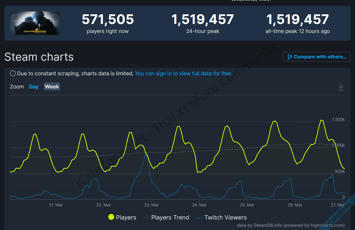 จำนวนผู้เล่น Counter-Strike ยังคงเพิ่มอย่างต่อเนื่อง (คนเล่นเยอะที่สุดในคืนวันอาทิตย์ของโลกตะวันตก) เมื่อสองสัปดาห์ก่อนเพิ่งทำสถิติใหม่ 1.41 ล้านคน ล่าสุดเมื่อคืนนี้สถิติเดิมถูกทำลายอีกแล้ว สถิติใหม่คือ 1.519 ล้านคน (สถิติเรียลไทม์ดูได้จาก SteamDB)