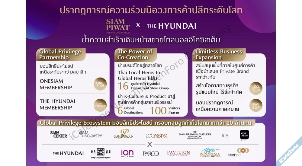 ตอกย้ำความสำเร็จในการสร้างระบบนิเวศธุรกิจระดับโลกอย่างไร้พรมแดนของกลุ่มบริษัทสยามพิวรรธน์ ผู้พัฒนาอสังหาริมทรัพย์และธุรกิจค้าปลีกชั้นนำ ผู้บริหารโกลบอลเดสติเนชั่น สยามพารากอน สยามเซ็นเตอร์ สยามดิสคัฟเวอรี่ หนึ่งในพันธมิตรเจ้าของไอคอนสยาม และสยาม พรีเมี่ยม เอาท์เล็ต กรุงเทพ ล่าสุดประกาศความร่วมมือครั้งสำคัญกับ Hyundai Department Store ผู้พัฒนากลุ่มห้างสรรพสินค้ารายใหญ่ในเกาหลีใต้ โดยร่วมลงนามในบันทึกข้อตกลง (MOU) เพื่อผสานศักยภาพความแข็งแกร่งของทั้ง 2 ฝ่าย ร่วมยกระดับและปฏิวัติวงการค้าปลีกก้าวสู่อนาคต เชื่อมต่อสิทธิประโยชน์เหนือระดับและมอบประสบการณ์และบริการสุดเอ็กซ์คลูซีฟให้กับสมาชิกอย่างสมบูรณ์แบบ อีกทั้งมีเป้าหมายร่วมกันที่จะพัฒนาและสร้างโอกาสทางธุรกิจใหม่ๆ ระหว่างประเทศ สู่โครงการจุดหมายปลายทางระดับโลก