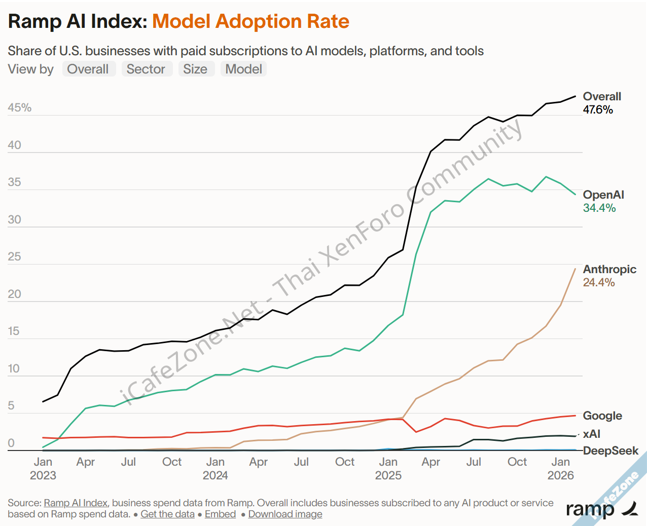 Ramp บริษัทซอฟต์แวร์ด้านการเงินขององค์กร (ซึ่งมีข้อมูลการจัดซื้อขององค์กรต่างๆ ที่ใช้โซลูชันของตัวเอง) รายงานสถิติการใช้ AI ในองค์กรประจำเดือนกุมภาพันธ์ 2026 พบว่าตลาดองค์กรมีอัตราการใช้งาน AI เพิ่มเป็น 47.6% แล้ว