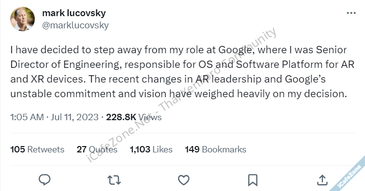 Mark Lucovsky ผู้อำนวยการอาวุโสด้านวิศวกรรมของกูเกิล ที่รับผิดชอบระบบปฏิบัติการและซอฟต์แวร์สำหรับ AR และ XR เปิดเผยผ่านทวิตเตอร์ของเขาว่าตอนนี้ได้ลาออกจากตำแหน่งแล้ว