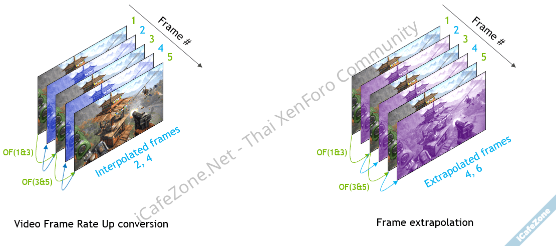 ภาพประกอบแสดงวิธีการสร้างเฟรมแบบ Interpolate (ซ้าย) และ Extrapolate (ขวา) - NVIDIA