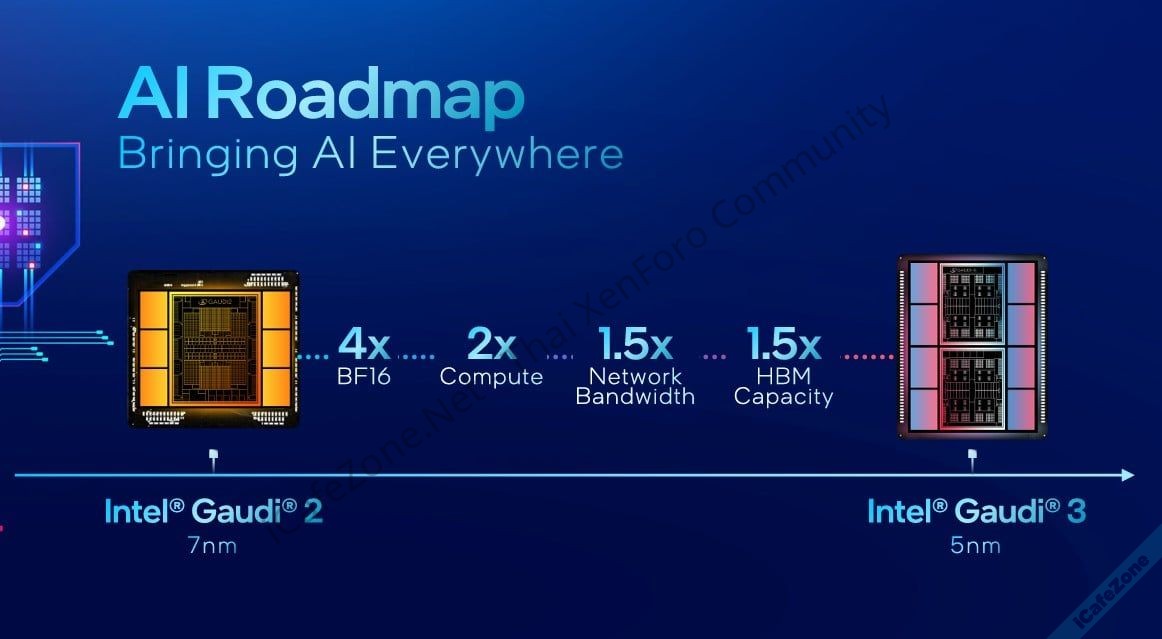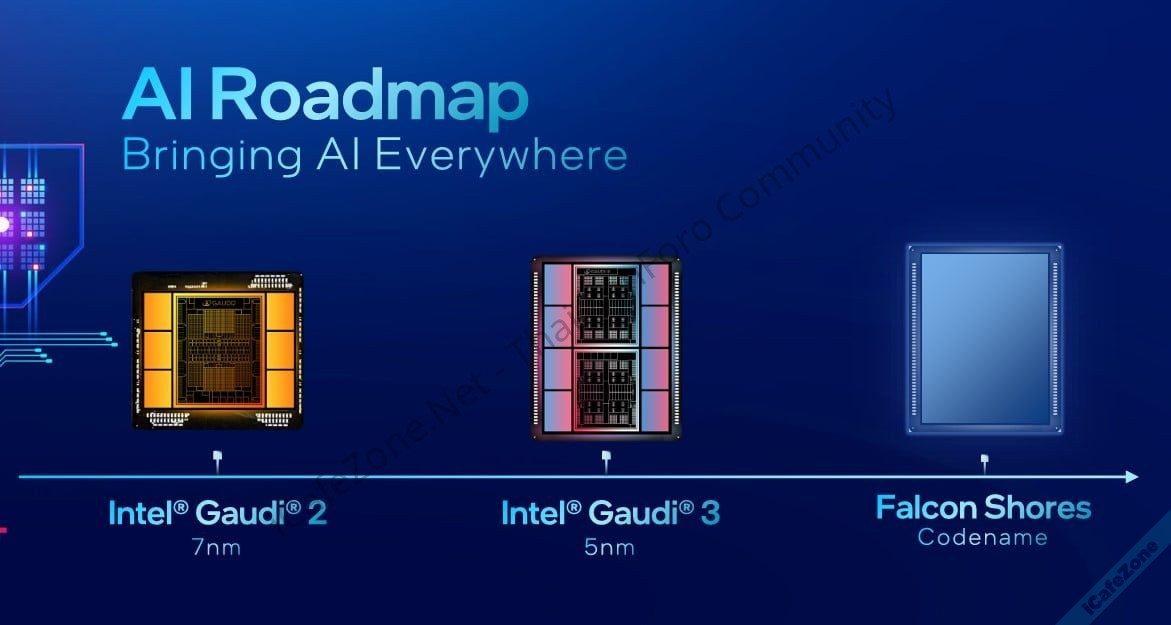 อินเทลยังประกาศรายละเอียดของชิปเร่งความเร็ว AI รุ่นใหม่ Habana Gaudi 3 ที่จะใช้กระบวนการผลิต 5nm, ประสิทธิภาพการคำนวณดีขึ้น 2 เท่า แต่ยังไม่ระบุว่าจะวางขายได้จริงช่วงไหน ชิปตระกูล Habana เกิดจากการเข้าซื้อบริษัท Habana Labs ในปี 2019 และเริ่มถูกใช้งานในเซิร์ฟเวอร์ขนาดใหญ่มากขึ้นเรื่อยๆ (เช่น เครื่องของ AWS) ในฐานะตัวเร่งประมวลผล AI ที่เป็นคู่แข่งของ NVIDIA A100/H100