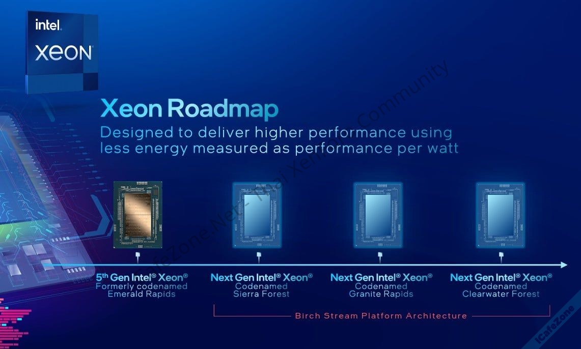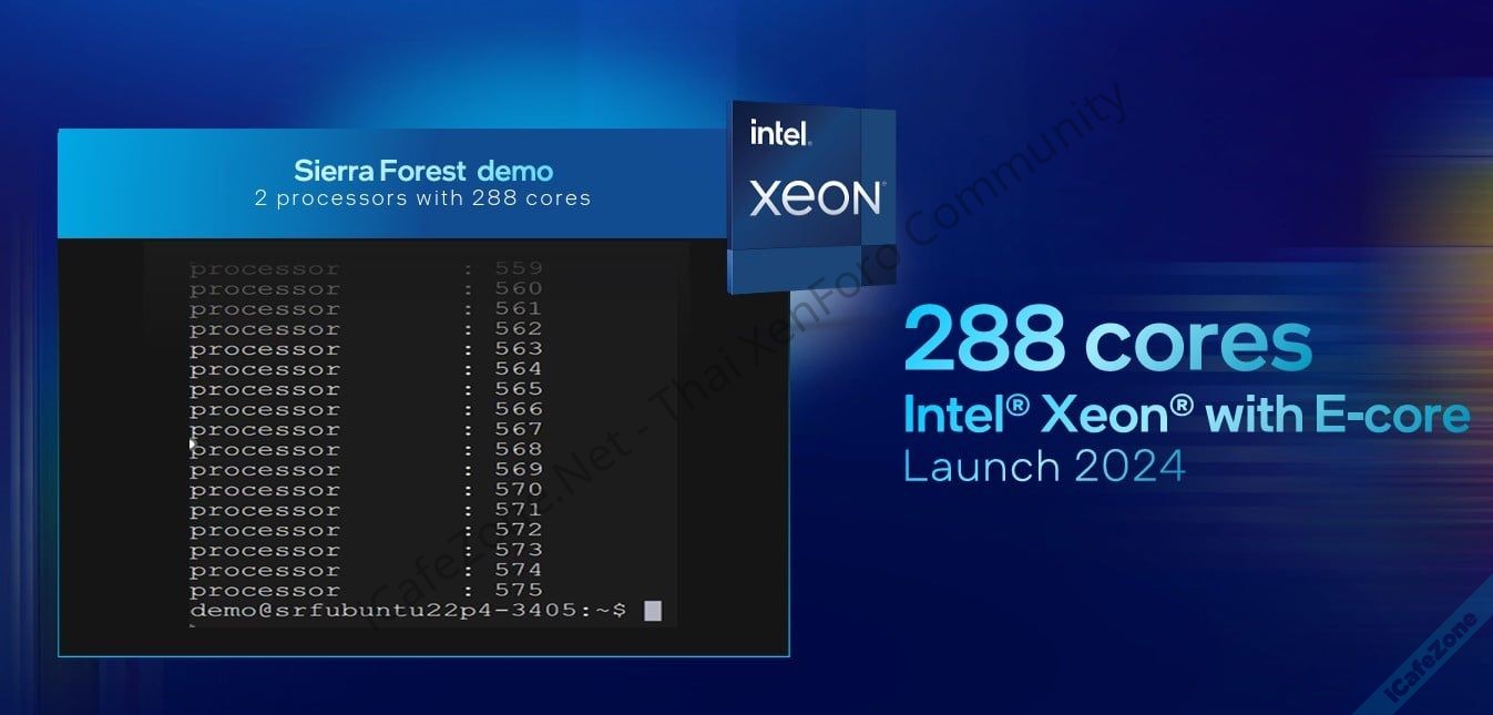 - Sierra Forest Xeon เวอร์ชันมีแต่ E-core ล้วนๆ วางขายครึ่งแรกของปี 2024 โดยจำนวนคอร์สูงสุด 288 คอร์กับซีพียูแบบ 2 ซ็อคเก็ต หรือคิดเป็นความหนาแน่นของซีพียูต่อแร็คเพิ่มขึ้น 2.5 เท่า และประสิทธิภาพต่อวัตต์เพิ่มขึ้น 2.4 เท่า เทียบกับ 4th Gen Xeon