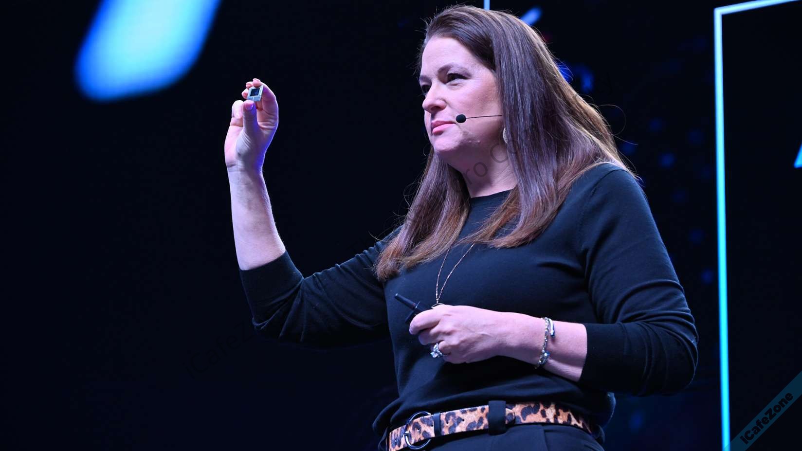 Michelle Johnston Holthaus ถือชิป Lunar Lake บนเวทีงาน CES 2024