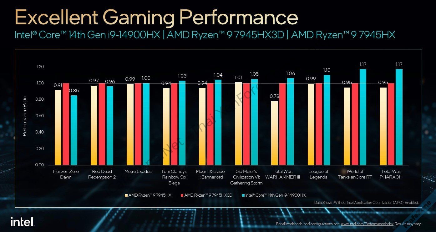 ตัวเลขเบนช์มาร์คของอินเทล เลือกเทียบ Core i9-14900HX กับคู่แข่งในซีรีส์ HX เหมือนกันคือ Ryzen 9 7945HX ซึ่งก็ชนะในผลการทดสอบเกมส่วนใหญ่ แต่ประสิทธิภาพเทียบกับเจนก่อนหน้าของตัวเอง (13th Gen Raptor Lake ไม่ Refresh) กลับไม่มีเทียบให้ดูกัน