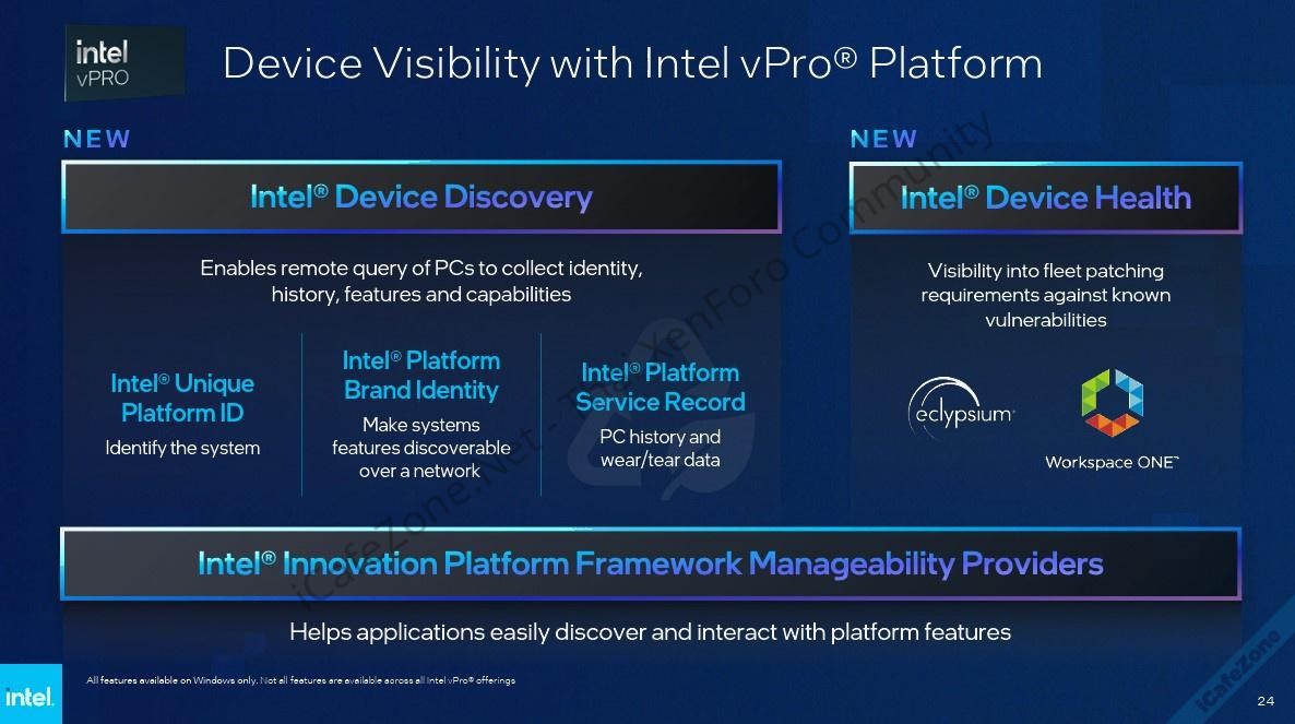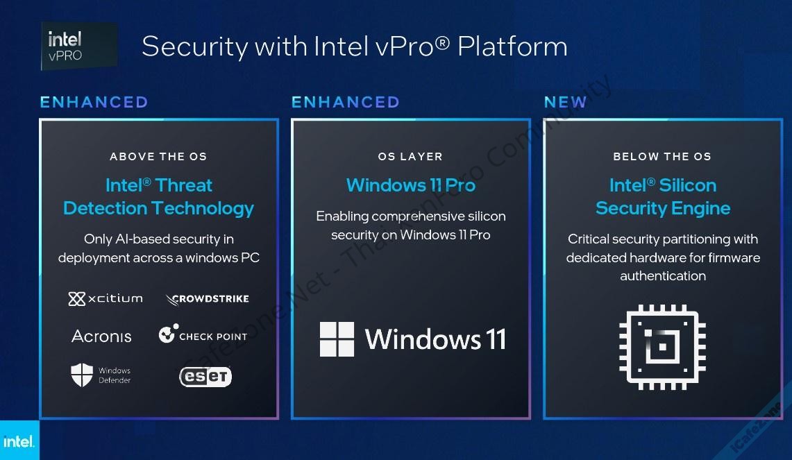ซีพียูกลุ่ม vPro มีฟีเจอร์ด้านบริหารจัดการและความปลอดภัย เพิ่มเข้ามาจากซีพียูฝั่งคอนซูเมอร์ ตัวอย่างคือฟีเจอร์ Thread Detection Technology ที่เปิดให้บริษัทซอฟต์แวร์ความปลอดภัยมาเรียกใช้งานอีกต่อหนึ่ง รอบนี้ vPro เพิ่มของใหม่อีกจำนวนหนึ่งคือ