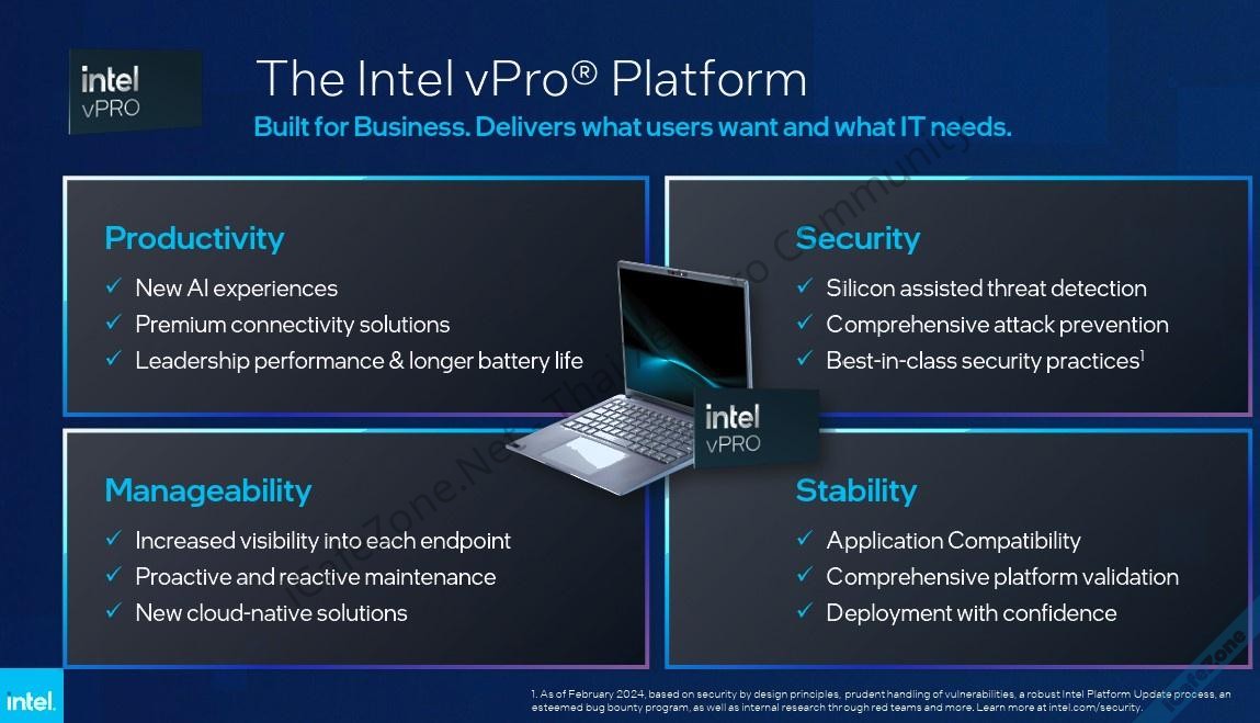 อินเทลเปิดตัวซีพียู Core Ultra (Meteor Lake) และ Core 14th Gen (Raptor Lake Refresh) เวอร์ชัน vPro สำหรับลูกค้าองค์กร โดยเป็นซีพียูเดิมที่เคยเปิดตัวไปแล้วทั้งหมด แค่ออกเวอร์ชัน vPro เพิ่มเข้ามา