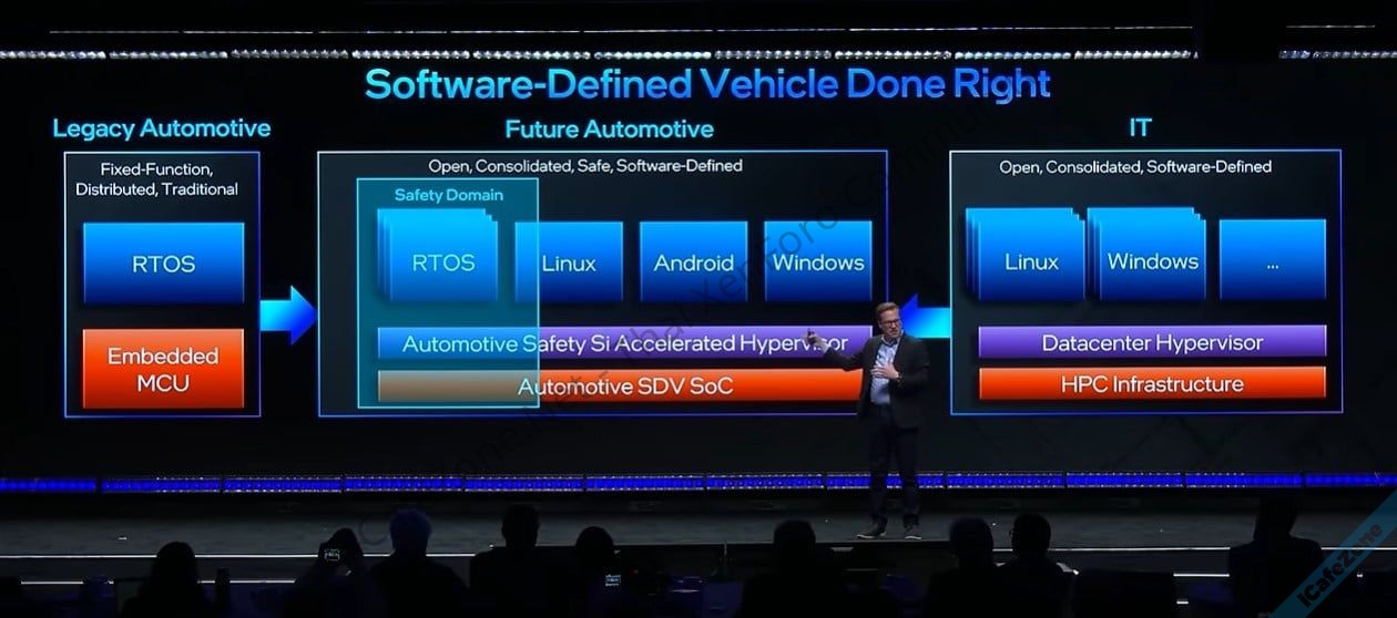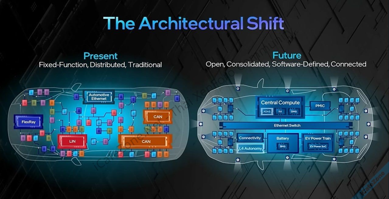 อินเทลบอกว่าที่ผ่านมา ชิป SoC ของตัวเองมีใช้งานในรถยนต์ 50 ล้านคันอยู่แล้ว แต่ตลาดรถยนต์กำลังเปลี่ยนแปลงครั้งใหญ่ไปสู่ยุค software-defined vehicle เปลี่ยนจากการใช้หน่วยประมวลผล electronic control units (ECU) ขนาดเล็ก จำนวนมากเกิน 100 ตัวต่อรถหนึ่งคัน มาเป็นแนวทางการมีหน่วยประมวลผลหลักประสิทธิภาพสูงตัวเดียว ทำงานร่วมกับ ECU ที่ลดลงเหลือน้อยกว่า 50 ตัวผ่านเครือข่าย Ethernet แทน เหมือนเป็นการนำสถาปัตยกรรมคอมพิวเตอร์ยกมาไว้ในรถยนต์ ซึ่งเป็นสิ่งที่อินเทลเชี่ยวชาญ
