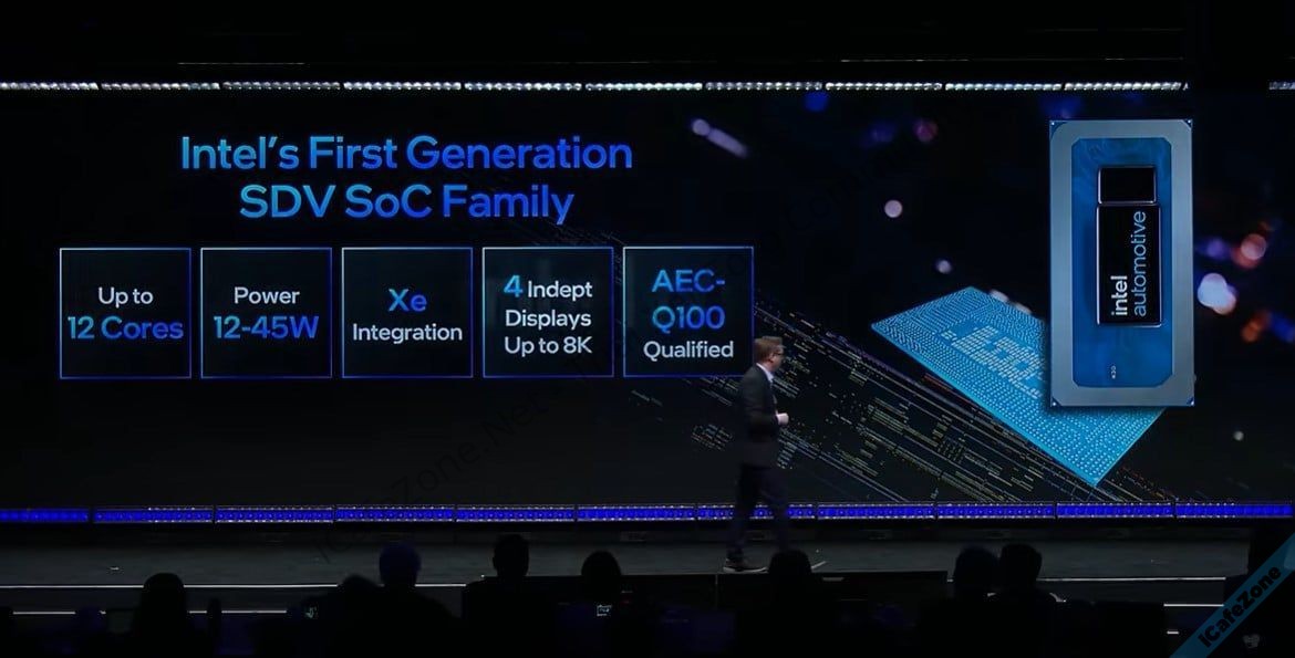 แนวทางของอินเทลคือนำชิปจากฝั่งพีซี (ที่ตอนนี้ใช้ชื่อทางการตลาดว่า "AI PC" ไปแล้ว) ยกมาใช้งานกับรถยนต์ ชิป SDV SoC รุ่นแรกยังไม่มีชื่อทางการค้า บอกสเปกคร่าวๆ แค่ว่าเป็นซีพียู 12 คอร์, จีพียู Xe, ใช้พลังงาน 12-45W, รองรับการต่อภาพออก 4 หน้าจอ, ผ่านมาตรฐาน AEC-Q100 สำหรับการใช้งานในรถยนต์