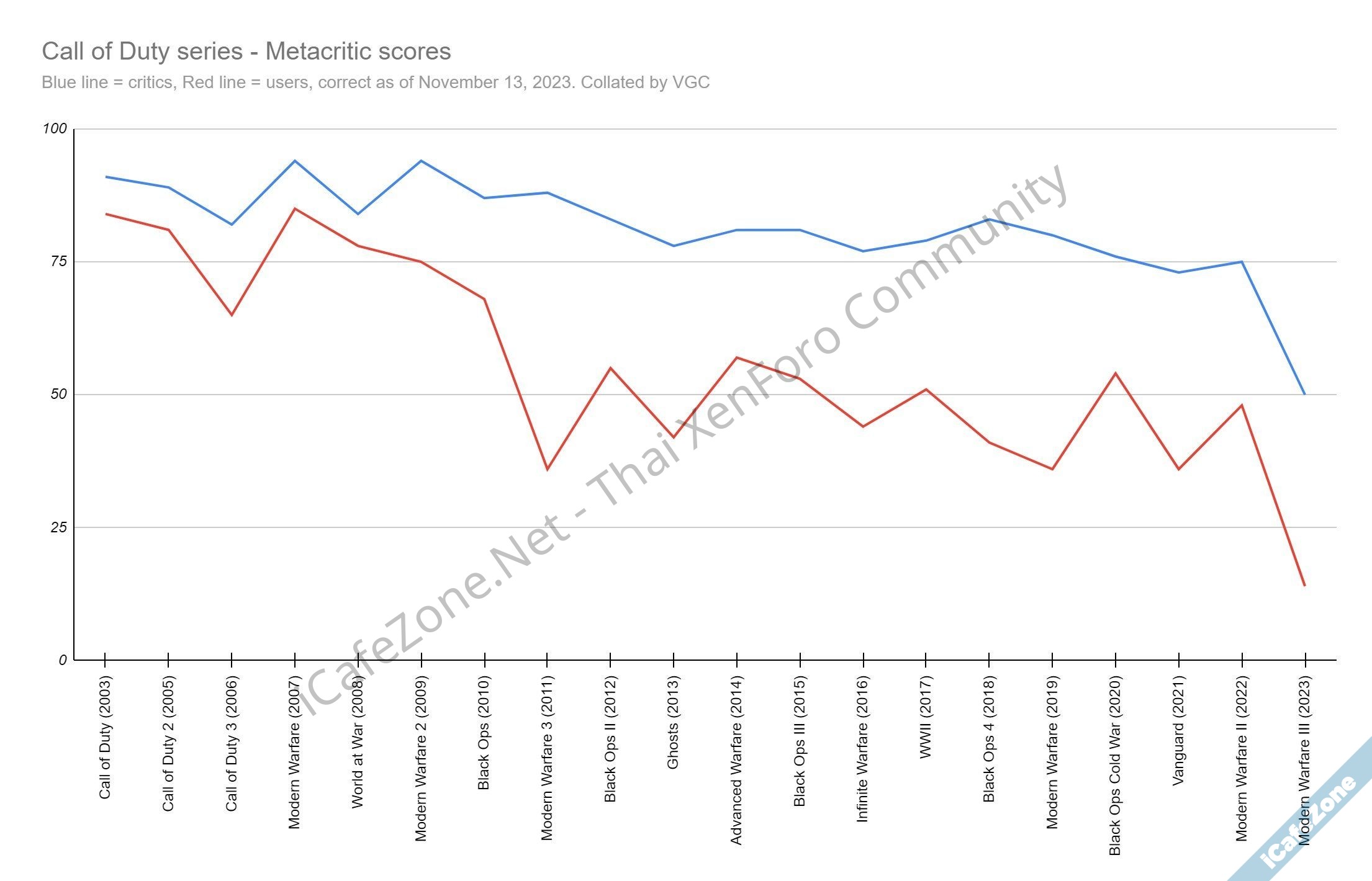 ภาพกราฟรวมรีวิว Metacritic ของแฟรนไชส์ Call of Duty จาก Video Games Chronicle