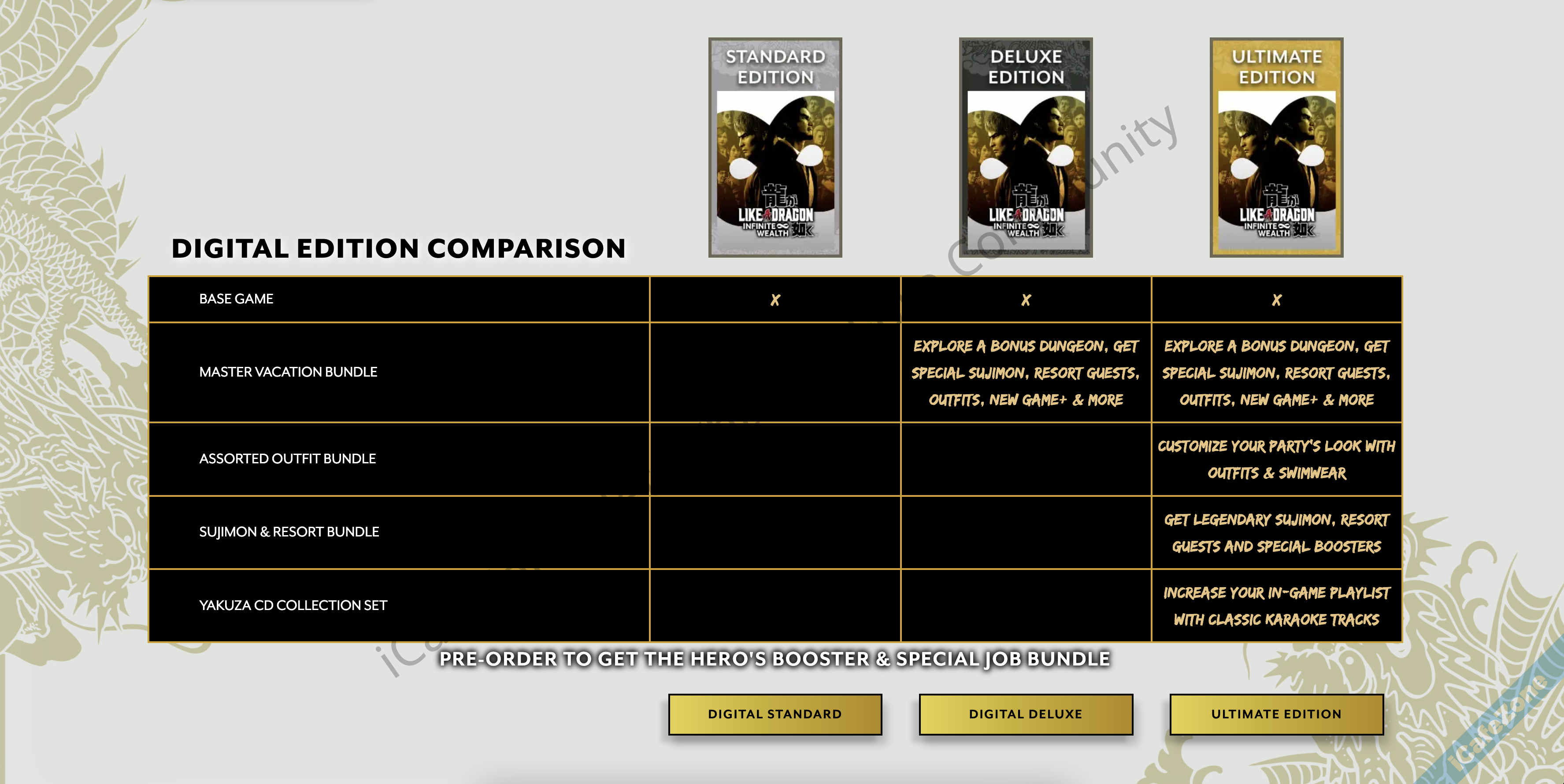 Sega เปิดเผยรายละเอียดเกม Like a Dragon: Infinite Wealth แต่ละเวอร์ชันที่เตรียมวางจำหน่ายในวันที่ 26 มกราคมนี้ ผ่านเว็บไซต์อย่างเป็นทางการ ซึ่งเผยให้เห็นว่าตัวเกมเวอร์ชัน Standard ไม่มีโหมด New Game+ ในขณะที่คนที่ซื้อเกมเวอร์ชัน Deluxe และ Ultimate จะได้ส่วนเสริมชื่อ Master Vacation Pack ซึ่งมีโหมด New Game+ รวมอยู่ในนั้นด้วย