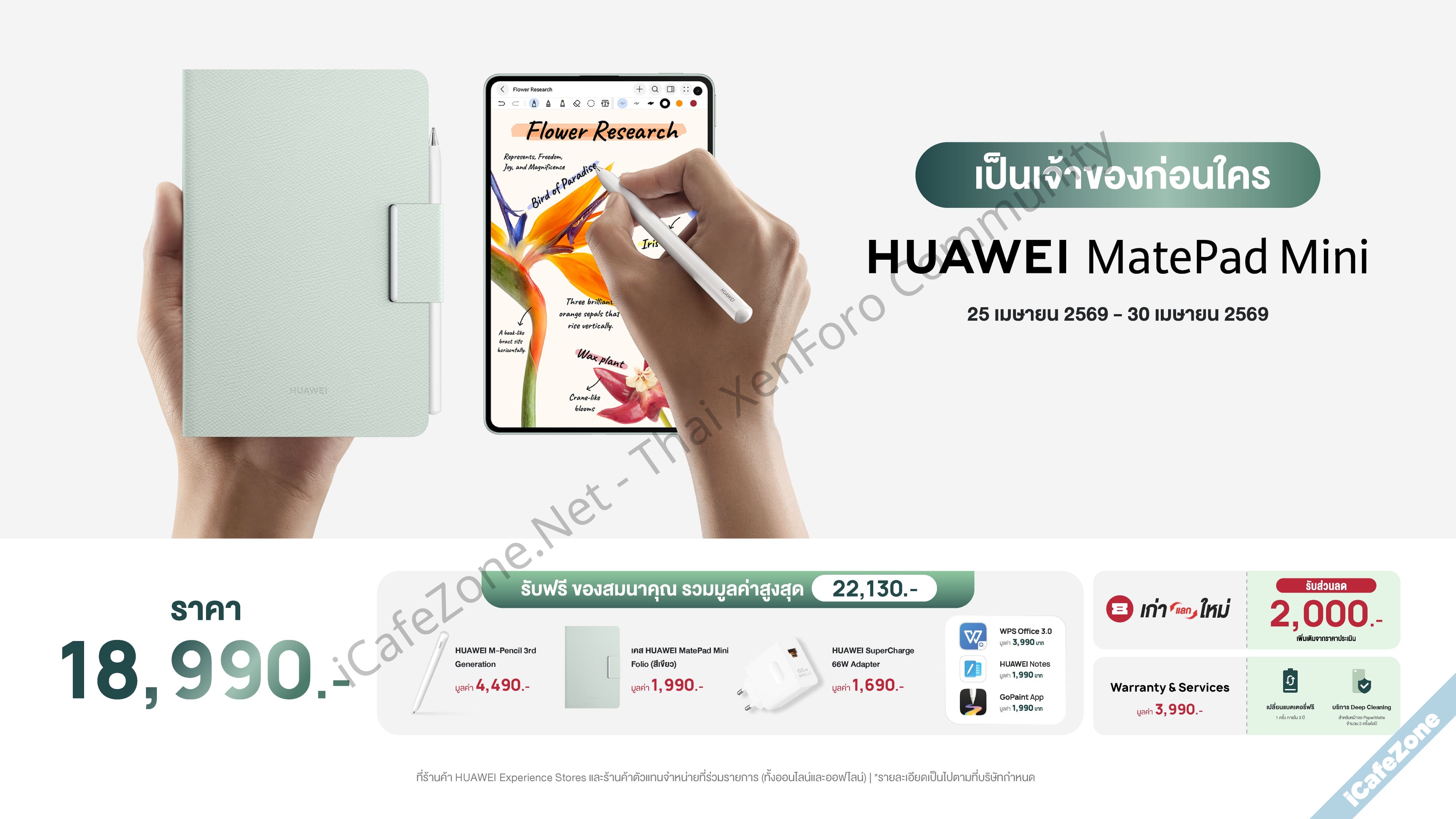 เตรียมเป็นเจ้าของ HUAWEI MatePad Mini ก่อนใคร! สามารถสั่งจองได้ตั้งแต่วันที่ 25 เมษายน 2569 ถึง 30 พฤษภาคม 2569 ในราคาเพียง 18,990 บาท พร้อมรับสิทธิพิเศษและของสมนาคุณ รวมมูลค่าสูงสุดถึง 22,130 บาท ได้แก่ HUAWEI M-Pencil 3rd Generation มูลค่า 4,490 บาท, เคส HUAWEI MatePad Mini Folio สีเขียว มูลค่า 1,990 บาท, HUAWEI SuperCharge 66W Adapter มูลค่า 1,690 บาท พร้อมแอปพลิเคชันที่ติดตั้งมาให้ใช้งานฟรี ได้แก่ WPS Office 3.0 มูลค่า 3,990 บาท, HUAWEI Notes มูลค่า 1,990 บาท และ GoPaint App มูลค่า 1,990 บาท นอกจากนี้ยังได้รับบริการ Warranty & Services มูลค่า 3,990 บาท ซึ่งครอบคลุมการเปลี่ยนแบตเตอรี่ฟรี 1 ครั้ง ภายใน 3 ปี และบริการ Deep Cleaning สำหรับหน้าจอ PaperMatte จำนวน 2 ครั้งต่อปี (แนะนำให้เคลมสิทธิ์ภายใน 30 วันนับจากวันที่ซื้อ และสามารถเก็บสิทธิ์ไว้ใช้บริการ Deep Cleaning ได้ภายในระยะเวลา 1 ปีแรกเท่านั้น) และสำหรับลูกค้าที่ต้องการอัปเกรด ยังมีโปรโมชันเก่าแลกใหม่ รับส่วนลดเพิ่มอีก 2,000 บาท จากราคาประเมิน สามารถสั่งจองได้ผ่านหน้าร้าน HUAWEI Experience Store ร้านค้าตัวแทนจำหน่ายที่ร่วมรายการ และช่องทางออนไลน์อย่าง HUAWEI Store, Lazada, Shopee และ TikTok Shop