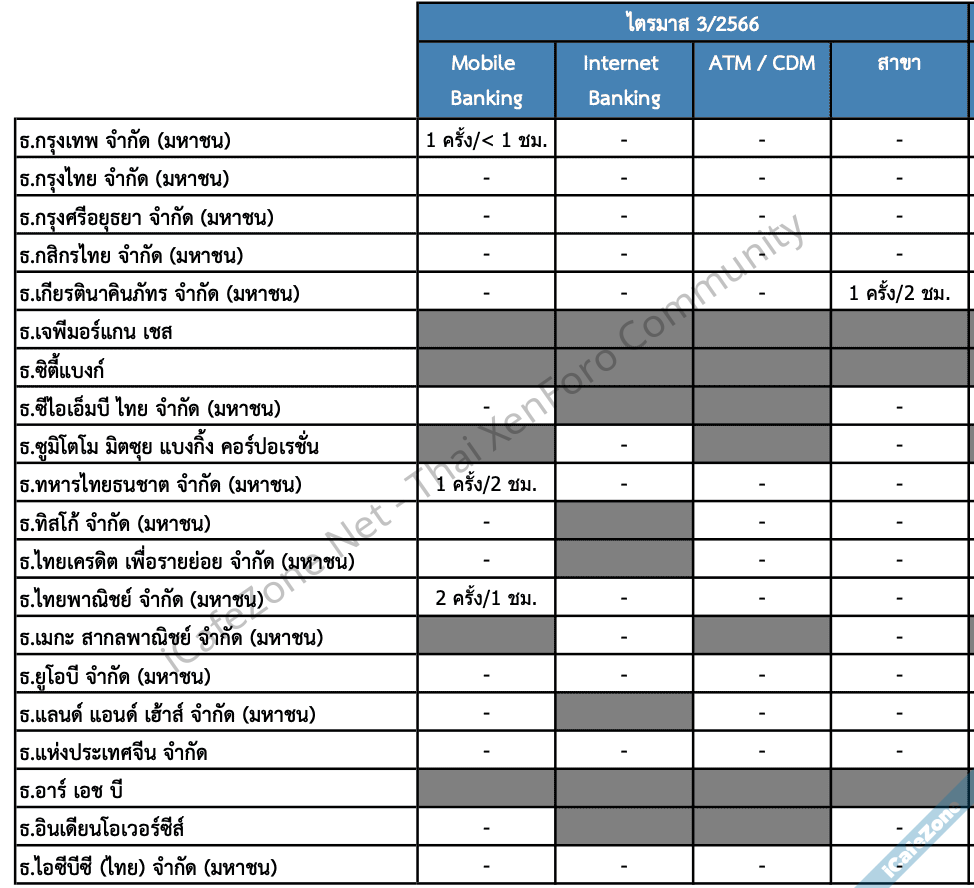 ธนาคารแห่งประเทศไทยออกรายงานธนาคารล่มในไตรมาสล่าสุดถึงเดือนกันยายน 2023 พบว่าระบบโดยรวมมีปัญหาไม่มากนัก มากที่สุดคือธนาคารทหารไทยธนชาตที่มีการล่ม 1 ครั้ง 2 ชั่วโมง