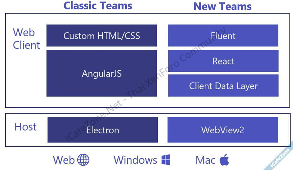 ไมโครซอฟท์เล่าว่าไคลเอนต์ตัวเดิมของ Teams เริ่มเขียนในปี 2015 (Teams เปิดตัวครั้งแรกปลายปี 2016) ตั้งเป้าหมายเรื่องการทำงานข้ามแพลตฟอร์มระหว่างเว็บ-เดสก์ท็อปเป็นสำคัญ จึงเลือกใช้เทคโนโลยีที่มีในตอนนั้นคือ Electron เป็นโฮสต์, AngularJS เป็นเฟรมเวิร์คเว็บ และสร้าง custom controls ของตัวเองขึ้นมาด้วย HTML/CSS