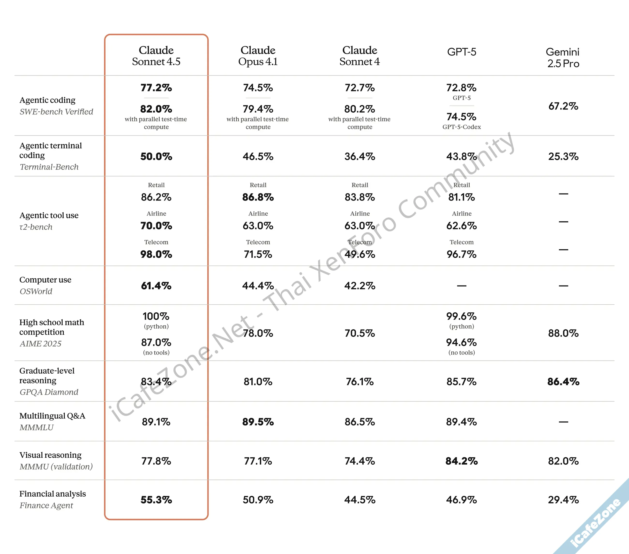จุดเด่นของ Claude Sonnet 4.5 คือยกระดับความสามารถด้านการเขียนโค้ดขึ้นไปอีกขั้น ทำคะแนนเบนช์มาร์คด้านการเขียนโค้ด SWE-bench Verified ได้ 77.2% (Opus 4.1 ทำได้ 74.5%, Sonnet 4 ทำได้ 72.7%) และถ้าเปิดโหมด parallel test-time compute (ทำงานแบบให้เหตุผล reasoning หลายแบบเพื่อหาวิธีที่ดีที่สุด) คะแนนจะขึ้นไปเป็น 82% แถมยังทำงานแก้ปัญหายากๆ ได้ต่อเนื่องนานถึง 30 ชั่วโมง