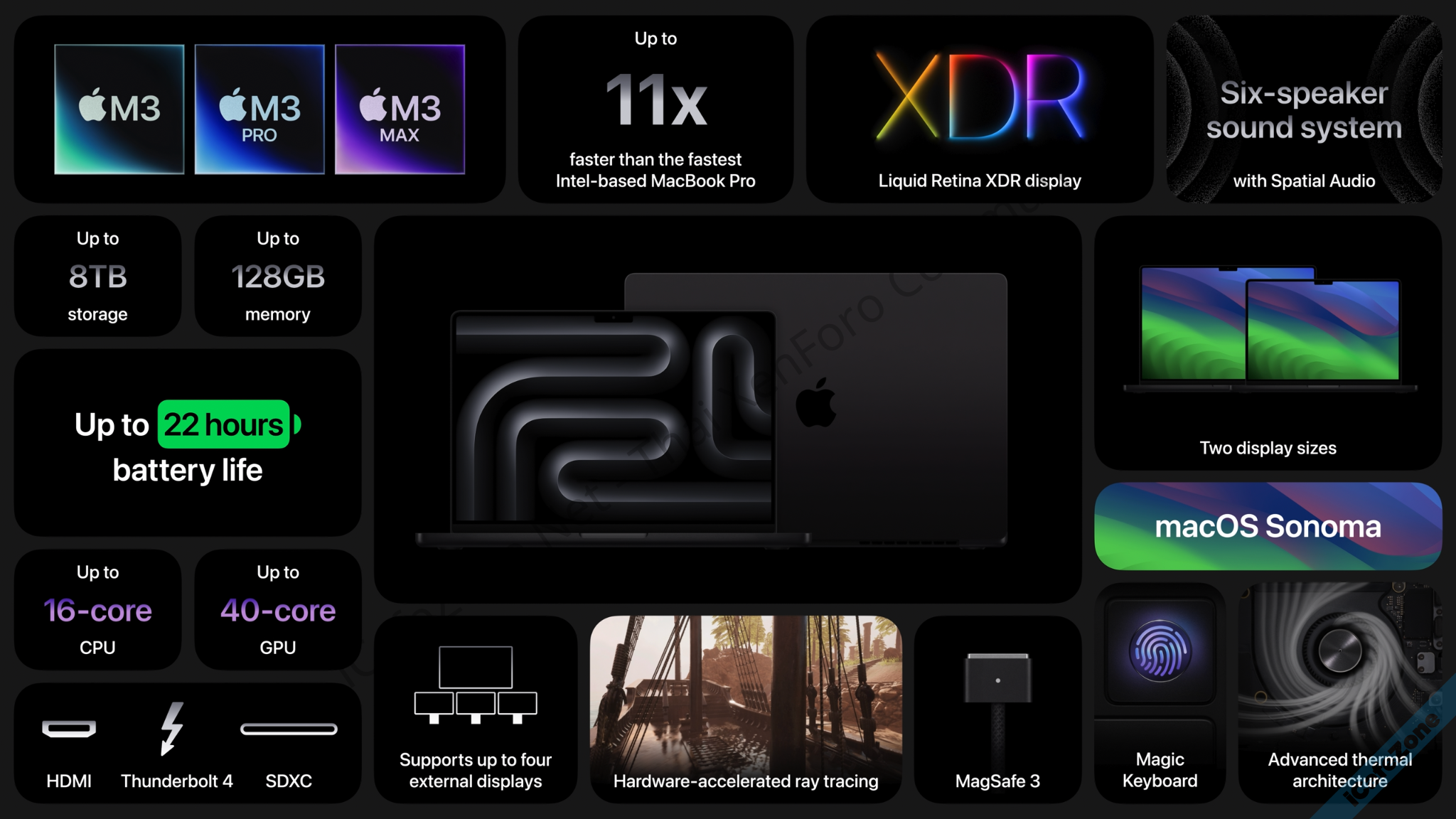 - MacBook Pro 14 นิ้ว และ 16 นิ้ว ชิป M3 Max เร็วขึ้นสูงสุด 2.5 เท่า เทียบกับ MacBook Pro 16 นิ้ว ชิป M1 Max, 11 เท่า เมื่อเทียบกับ MacBook Pro ซีพียูอินเทลรุ่นที่เร็วที่สุด นอกจากนี้ยังเพิ่มแรมได้สูงสุดถึง 128GB