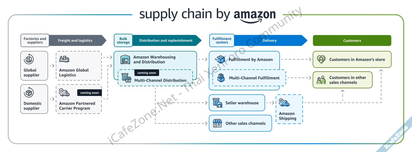 Supply Chain by Amazon เป็นเวอร์ชันอัพเกรดของ FBA เพิ่มการไปรับของจากหน้าโรงงานทั่วโลก จัดการเรื่องการขนส่งสินค้าข้ามประเทศ ภาษีนำเข้าให้ด้วย โดยที่ผู้ขายไม่จำเป็นต้องสัมผัสสินค้าเลยด้วยซ้ำ