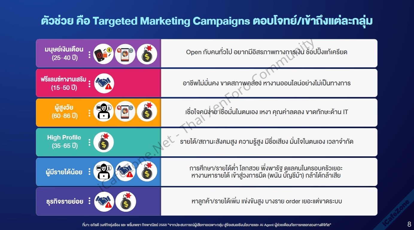 เหตุผลที่เหยื่อแต่ละกลุ่มโดนหลอกสำเร็จ อาจเป็นเพราะมิจฉาชีพมีแคมเปญ targeted marketing ตอบโจทย์ปมในใจของเหยื่อแต่ละกลุ่ม เช่น