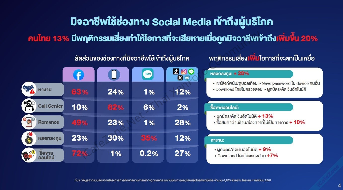 ช่องทางที่ใช้โจมตีก็แตกต่างกัน ตัวอย่างคือ แก๊ง call center ใช้การโทรศัพท์ 82%, การหลอกลงทุนทำผ่าน SMS เป็นสัดส่วน 35% ส่วนกลุ่มหางาน หาคู่ ซื้อขายออนไลน์ มาทาง Facebook เป็นหลัก