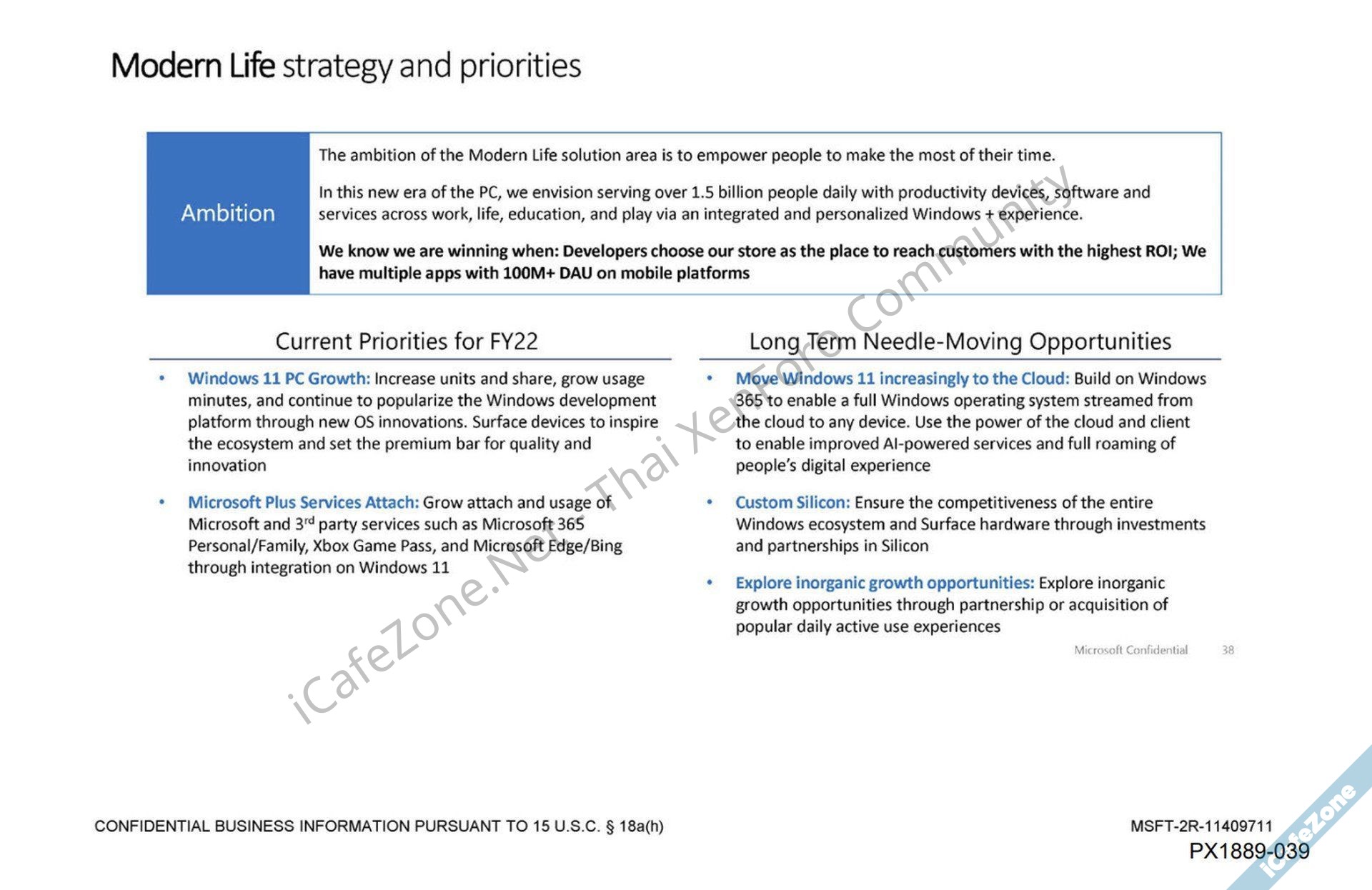 เอกสารนี้เขียนยุทธศาสตร์ Microsoft Life ที่ต้องการให้ผู้คน 1.5 พันล้านคนใช้ฮาร์ดแวร์และซอฟต์แวร์ของไมโครซอฟท์ แผนการในระยะสั้นคือการเพิ่มจำนวนพีซี Windows 11 ผ่านฟีเจอร์ต่างๆ และใช้บริการของไมโครซอฟท์ เช่น Microsoft 365, Xbox Game Pass, Edge, Bing ที่ผูกกับ Windows 11 อยู่แล้ว
