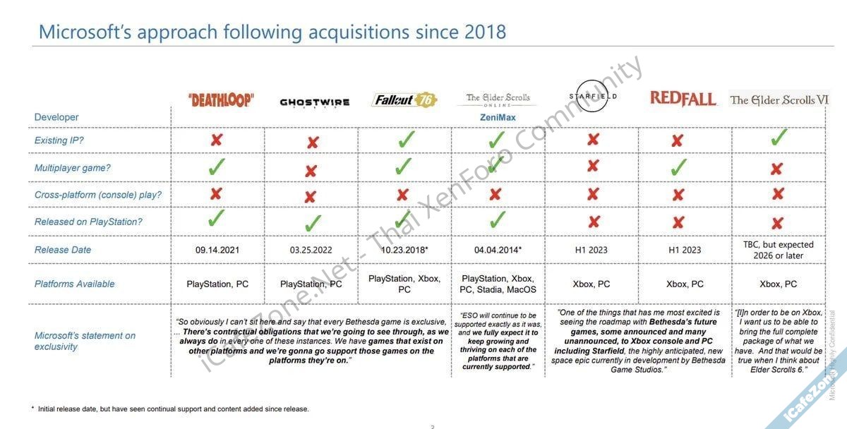 เอกสารฉบับนี้สรุปรายชื่อเกมของสตูดิโอ Bethesda ที่ไมโครซอฟท์ซื้อกิจการมา นับตั้งแต่ปี 2018 โดยเกมรุ่นแรกๆ อย่าง The Elder Scrolls Online, Fallout 76, Deathloop และ Ghostwire: Tokyo ลง PlayStation ด้วยเพราะมีสัญญาแต่เดิมก่อนไมโครซอฟท์ซื้อกิจการ ในขณะที่เกมของปี 2023 คือ Starfield กับ Redfall ไม่ลง PlayStation แล้ว ซึ่งนโยบายนี้รวมถึง The Elder Scrolls VI ด้วย