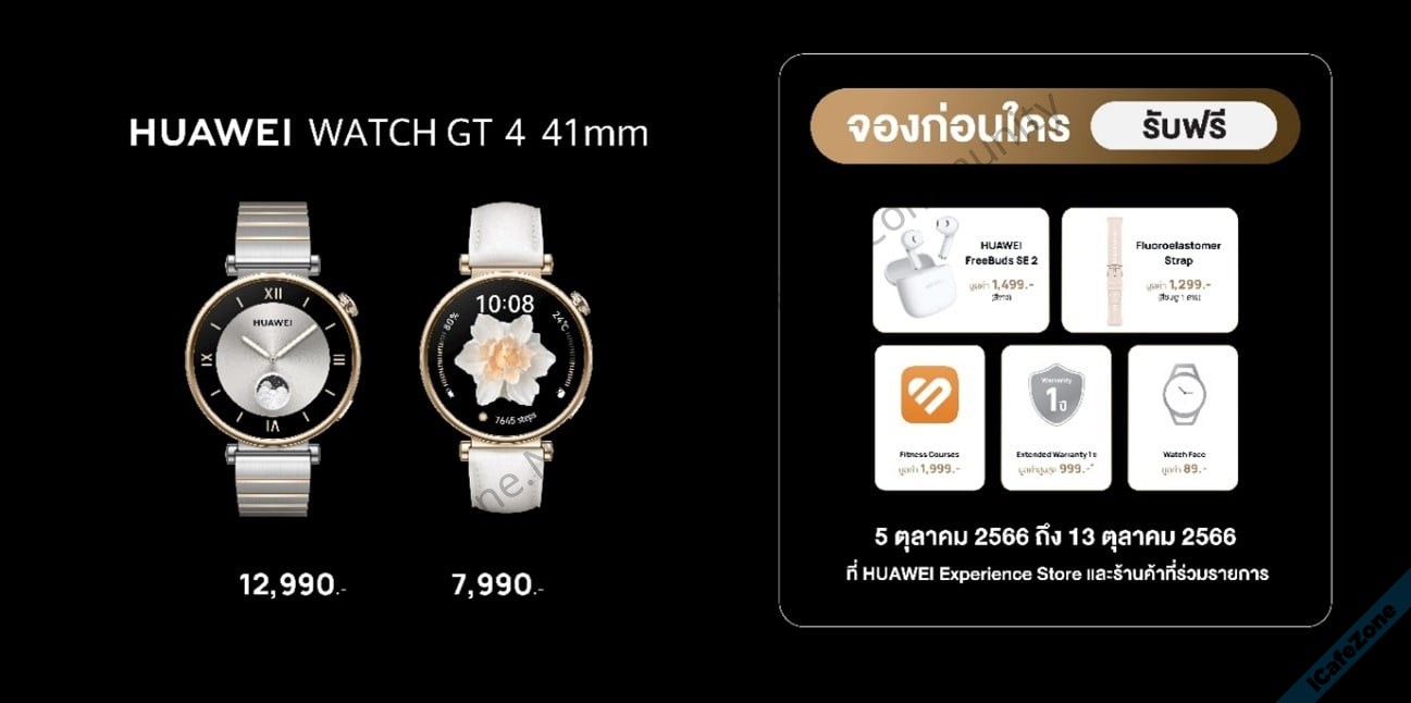 - HUAWEI WATCH GT 4 ขนาด 41 มม. สีดำ สายฟลูออโรอีลาสโตเมอร์ ในราคาเพียง 6,990 บาท วางจำหน่ายที่ช่องทางออนไลน์บนร้านค้าอย่างเป็นทางการของหัวเว่ยบนแพลตฟอร์ม Lazada และ Shopee