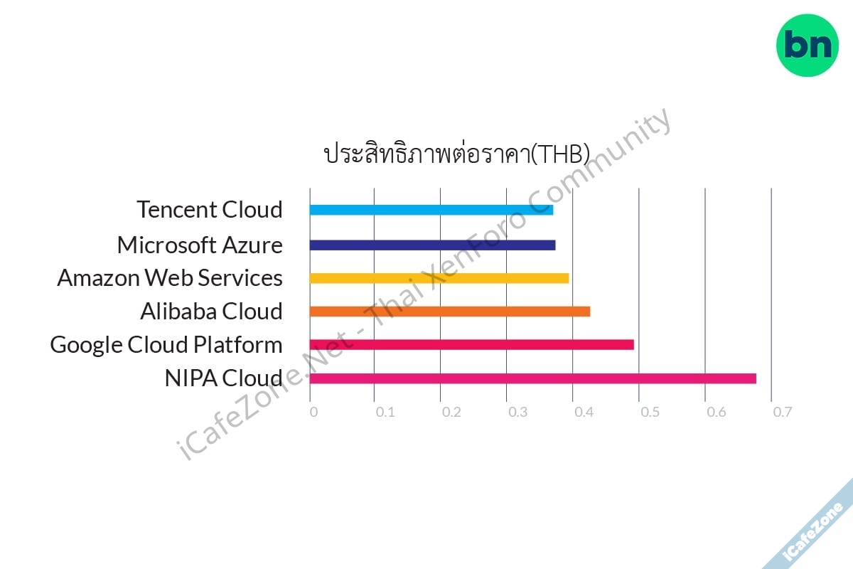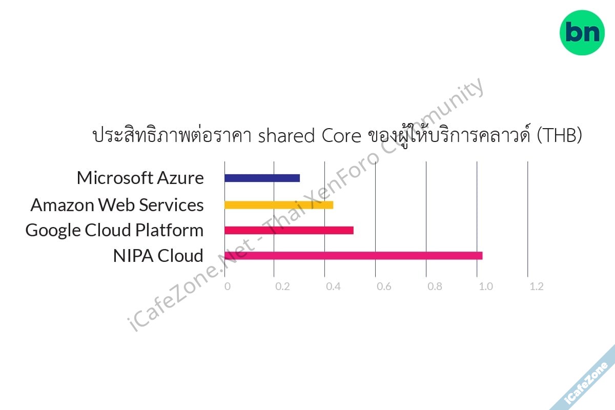เมื่อเปรียบเทียบประสิทธิภาพต่อราคา (performance ของ vCPU per price ของการใช้งาน shared core) จะพบว่า NIPA Cloud Space ให้บริการในระดับที่สูงกว่าคลาวด์ระดับโลกอย่าง Amazon Web Services, Microsoft Azure และ Google Cloud Platform ถึง 2-3 เท่า