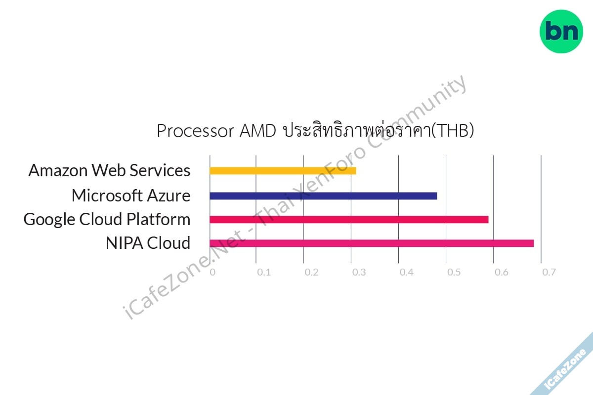 อย่างไรก็ตาม หากคำนวณค่าเฉลี่ยของทุก machine type จะมีความแตกต่างของยี่ห้อฮาร์ดแวร์ที่ใช้งาน เนื่องจาก Cloud ที่เป็น Global Cloud นั้นมี machine type ที่หลากหลาย จึงอาจไม่ใช่ค่าที่สะท้อนความคุ้มค่ามากนัก เราจึงเปรียบเทียบฮาร์ดแวร์ที่เป็นยี่ห้อเดียวกัน นั่นคือ AMD EPYC โดยนำมาคิดเป็นค่า performance per price เช่นกัน โดยจากการทดสอบพบว่า NIPA Cloud Space มีค่าประสิทธิภาพต่อราคาสูงที่สุด กล่าวคือ สะท้อนถึงความคุ้มค่าที่มากที่สุด