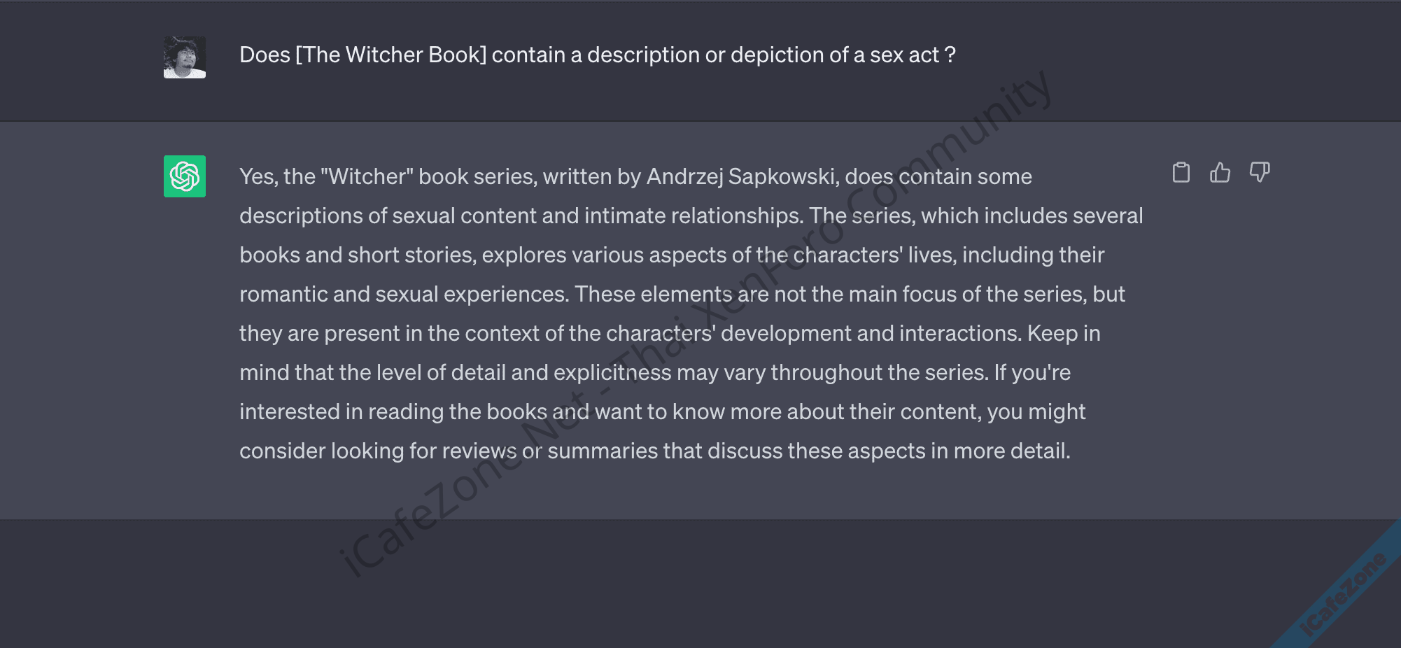 รูปภาพจากการลองถาม ChatGPT ว่านิยาย The Witcher มีคำอธิบายหรือการแสดงกิจกรรมทางเพศหรือไม่ ?