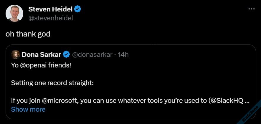 Steven Heidel หนึ่งในพนักงานด้านเทคนิคที่เพิ่งเข้ามาทำงาน OpenAI ได้เพียงไม่กี่เดือนออกมาโพสเรื่องนี้ว่ายินดีย้ายไปอยู่ไมโครซอฟท์ แต่ยังไงก็จะไม่ขอใช้ Microsoft Teams หลังจากนั้นไม่นาน Dona Sarkar ผู้พัฒนาฟีเจอร์ Copilot ก็ออกมายืนยันว่าพนักงานที่ย้ายมาสามารถใช้เครื่องมือที่ถนัดได้ ไม่ว่าจะเป็น Slack, Zoom, หรือ WebEx แม้แต่ตอนนี้เองทีม GitHub ก็ใช้ Slack อยู่