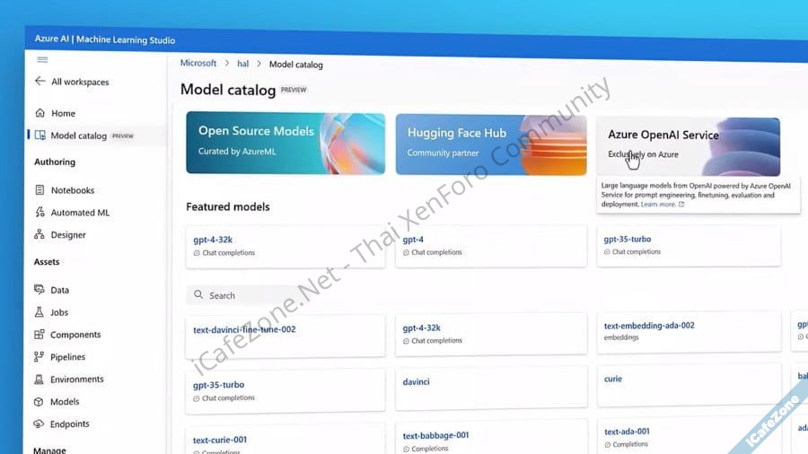 - คลังโมเดล มีให้เลือกทั้งจาก Azure OpenAI Service (โมเดลไมโครซอฟท์ + OpenAI ซึ่งรวมถึง GPT4 ด้วย), คลังของ Hugging Face, โมเดลโอเพนซอร์สอื่นๆ