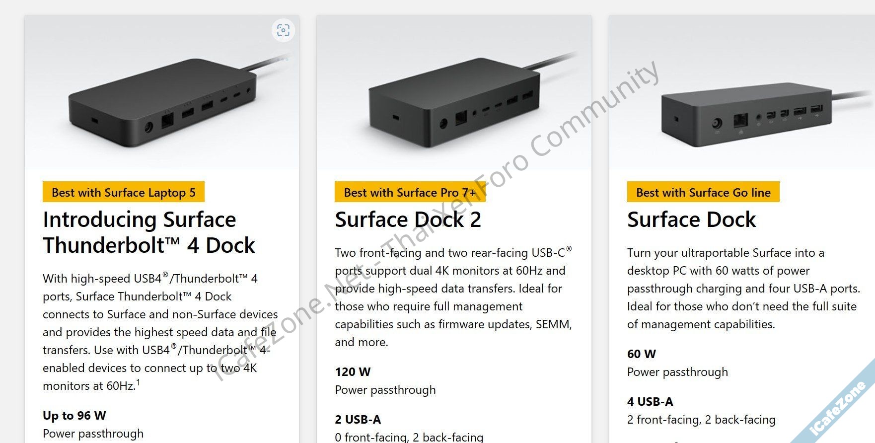 Surface Thunderbolt 4 Dock มีขนาดเล็กลงกว่า Surface Dock 2, จุดเด่นสำคัญคือรองรับการเชื่อมต่อ USB4/Thunderbolt 4 ตามชื่อสินค้า อัตราการส่งข้อมูลสูงสุด 40 Gbps, สามารถต่อจอมอนิเตอร์ 4K 60Hz ได้สองตัวพร้อมกัน