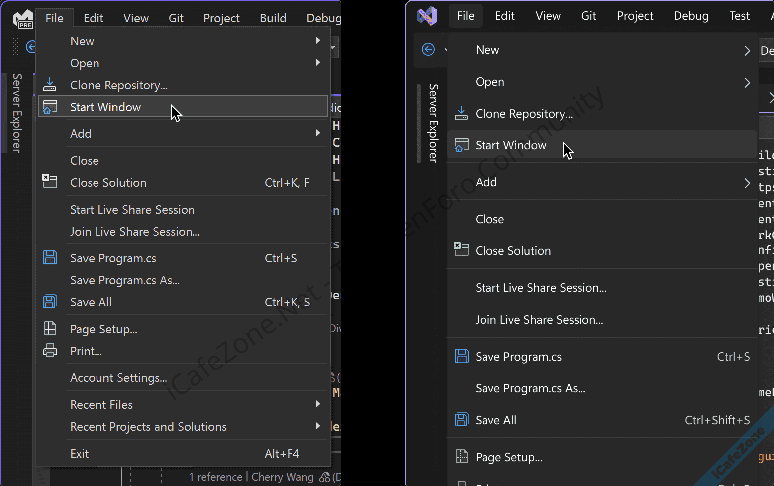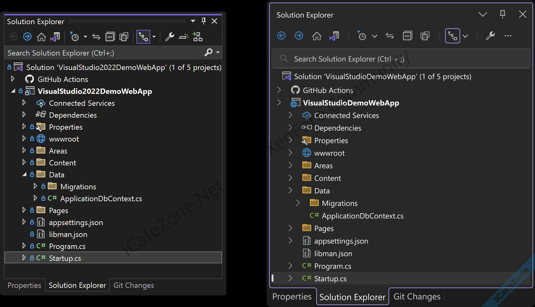 Solution Explorer ของเก่า (ซ้าย) ใหม่ (ขวา) ดูโปร่งขึ้นกว่าเดิม