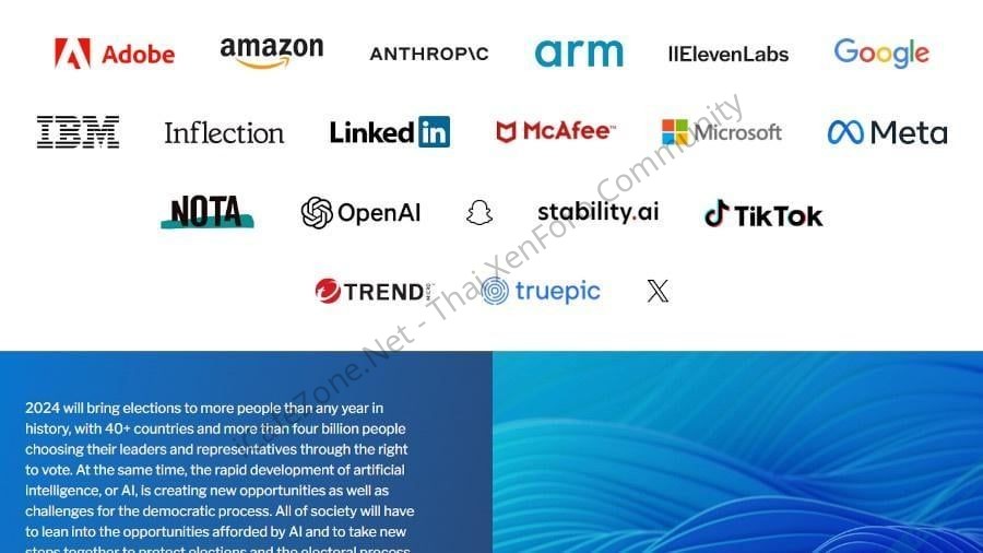 16 ก.พ.2567 ที่การประชุมความมั่นคงมิวนิค (Munich Security Conference - MSC) บริษัทเทคโนโลยีชั้นนำ 20 ราย ประกาศข้อตกลงว่าจะร่วมมือป้องกันเนื้อหา AI ที่แทรกแซงการเลือกตั้งทั่วโลกในปีนี้ ที่มีผู้มีสิทธิ์เลือกตั้งมากกว่าสี่พันล้านคนในกว่า 40 ประเทศ