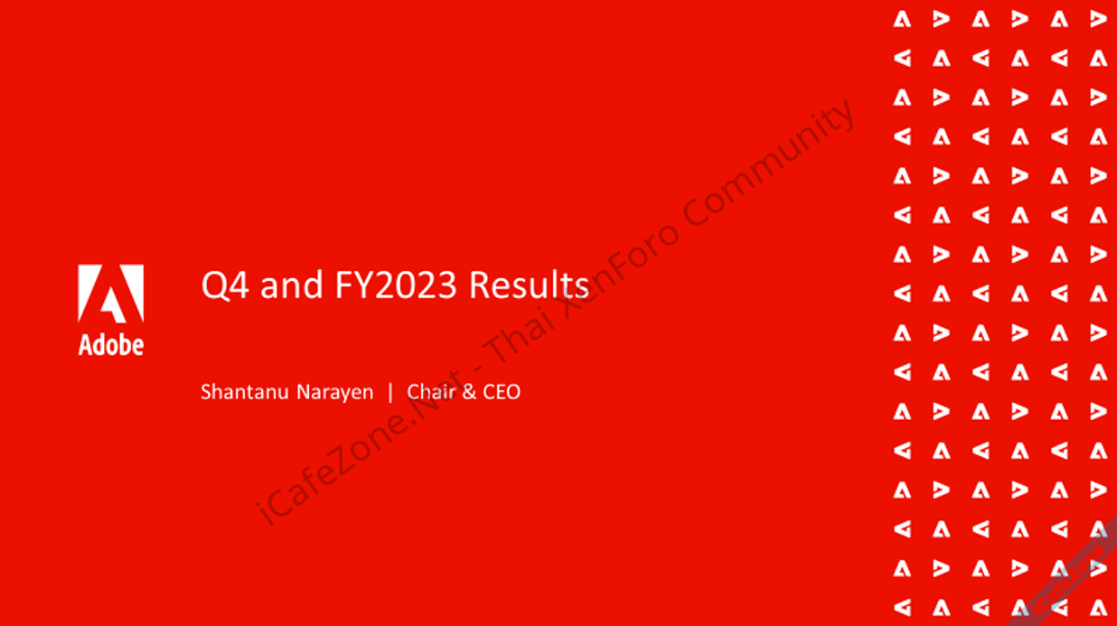 Adobe รายงานผลประกอบการของไตรมาสที่ 4 ตามปีการเงินบริษัท 2023 สิ้นสุดวันที่ 1 ธันวาคม รายได้เติบโตทำสถิติใหม่อีกไตรมาสที่ 5,048 ล้านดอลลาร์ เพิ่มขึ้น 12% จากช่วงเดียวกันในปีก่อน มีกำไรสุทธิตามบัญชี GAAP 1,483 ล้านดอลลาร์