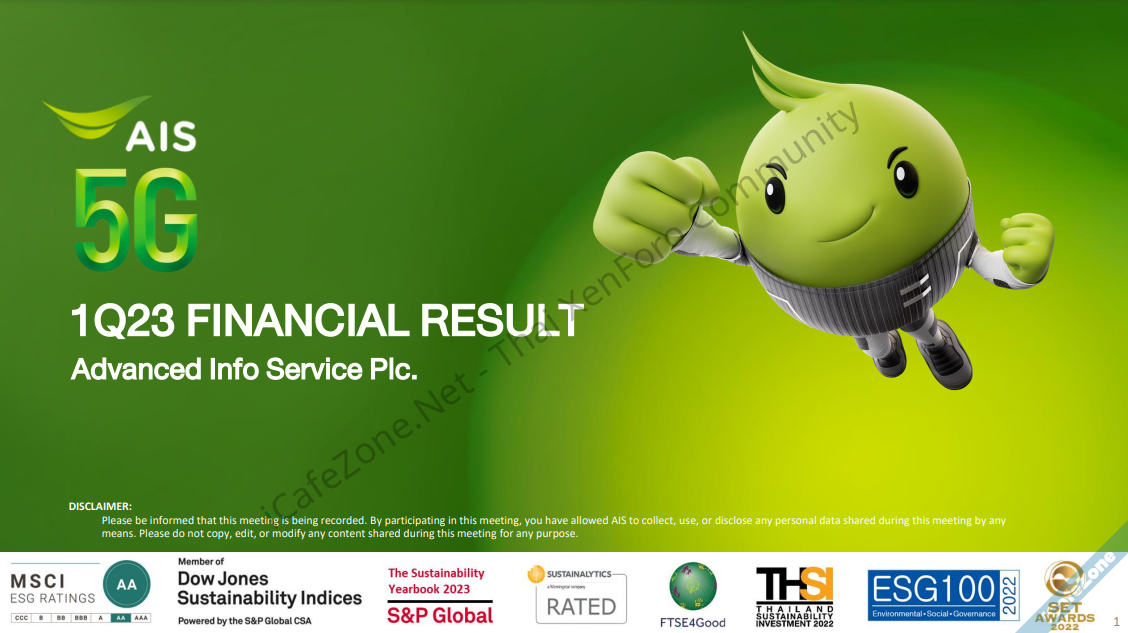 เอไอเอส รายงานผลการดำเนินงานประจำไตรมาสที่ 1 ปี 2566 มีรายได้จากการให้บริการหลัก 33,351 ล้านบาท เติบโต 2.3% เทียบกับไตรมาสเดียวกันในปีก่อน ส่วนรายได้รวมทั้งหมดเพิ่มขึ้น 3.2% เป็น 46,712 ล้านบาท และมีกำไรสุทธิเพิ่มขึ้น 7.1% เป็น 6,757 ล้านบาท