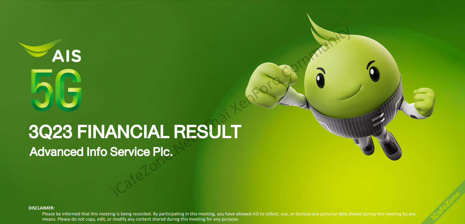เอไอเอสรายงานผลประกอบการประจำไตรมาสที่ 3 ปี 2566 โดยภาพรวม 9 เดือน เติบโต 2.3% เมื่อเทียบกับช่วงเดียวกันในปีก่อน แบ่งเป็นธุรกิจโทรศัพท์มือถือเติบโต 1.0% และอินเทอร์เน็ตบ้านเติบโต 15% มีกำไรสุทธิ 22,084 ล้านบาท เพิ่มขึ้น 18%