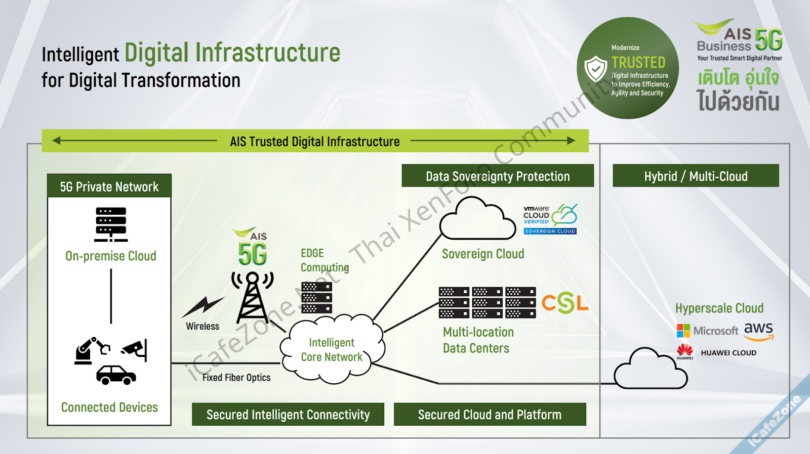 AIS Business มีบริการคลาวด์ที่ครบวงจรอย่าง AIS Cloud X ระบบนิเวศ Cloud อัจริยะ ที่พร้อมบริการหลายรูปแบบให้ธุรกิจเลือกใช้งานซึ่งพร้อมต่อเชื่อมกับ Infrastructure ในรูปแบบ MEC หรือ Edge ซึ่งทำให้ประสิทธิภาพในการเชื่อมต่อกับอุปกรณ์ปลายทางสูงขึ้นได้โดยมี latency ต่ำ รวมถึง Infrastructure ที่พร้อมสนับสนุนการทำ hybrid/multi-cloud เปิดทางให้องค์กรสามารถใช้งานคลาวด์ รวมถึงศูนย์ข้อมูลในองค์กรเองผสานกันได้อย่างเหมาะสมโดยยังมีการจัดการที่ดี ตลาดจนโซลูชันเพื่อความต่อเนื่องในการให้บริการทั้งโครงสร้างแบบ High Availability และการทำศูนย์ข้อมูลสำรองในกรณีมีเหตุภัยพิบัติ Disaster Recovery ตลอดจนหากองค์กรมีเงื่อนไขในการเก็บข้อมูลทีมีความละเอียดอ่อนในประเทศตามเงื่อนไขการกำกับดูแลของอุตสาหกรรม AIS Business ก็มีบริการ Sovereign Cloud ให้บริการ เพื่อให้องค์กรมีความมั่นใจมากขึ้นในเรื่องเสถียรภาพ และความมั่นคงปลอดภัยของข้อมูล
