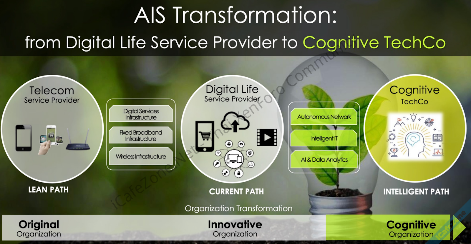 ชื่อ AIS เป็นที่รู้จักกันเป็นอย่างดีในฐานะผู้ให้บริการโทรคมนาคมอันดับหนึ่งของไทย แต่หลายปีที่ผ่านมา AIS ก็ได้ทำ Transformation ปรับเปลี่ยนแนวทางของบริษัทกลายเป็น Digitial Life Service Provider ที่ลูกค้าจะสามารถเลือกใช้บริการจาก AIS ได้หลากหลายยิ่งขึ้น ไม่ใช่เพียงแค่การสื่อสารที่เป็นท่อเชื่อมต่อไปยังบริการอื่นๆ เท่านั้น แต่บริการต่างๆ ที่สำคัญในยุคดิจิทัลก็สามารถเลือกใช้ AIS ได้เสมอ และขั้นต่อไปของ AIS คือการก้าวไปสู่องค์กรโทรคมนาคมอัจฉริยะ หรือ Cognitive Tech-Co เป็นการขยายบริการ จากเดิมที่เป็นผู้ให้บริการโทรศัพท์สู่การเป็นผู้ให้บริการที่รู้ว่าลูกค้าต้องการอะไรหรือมีปัญหาการใช้งานอย่างไรบ้าง ผ่านการใช้งานเทคโนโลยีอย่าง AI, Data Analytics, Intelligent IT, และ Autonomous Network