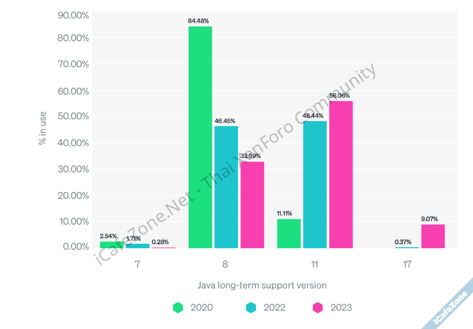 ประเด็นเรื่องเวอร์ชันของ Java ที่นิยมใช้งาน อันดับหนึ่งยังเป็น Java 11 LTS ที่มีส่วนแบ่งเพิ่มเป็น 56.06%, อันดับสอง Java 8 รุ่นพิมพ์นิยมตลอดกาล ส่วนแบ่งลดเหลือ 32.99% และอันดับสาม Java 17 LTS รุ่นล่าสุด ส่วนแบ่งเพิ่มมาเป็น 9.07%