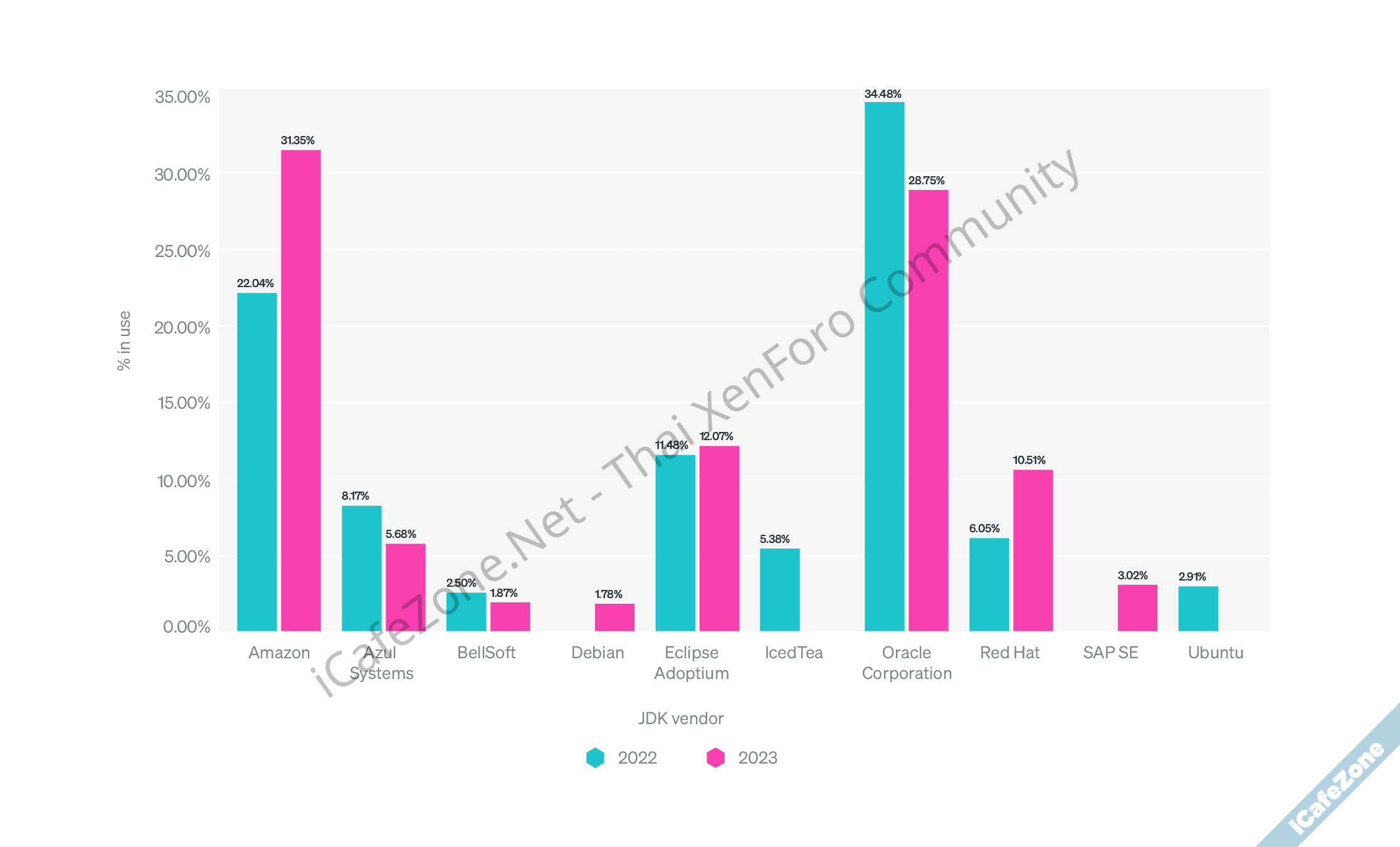 การเปลี่ยนแปลงสำคัญของโลก Java ปี 2023 คือ Amazon Corretto ซึ่งเป็นดิสโทร Java Developer Kit (JDK) เวอร์ชันแจกฟรีของ Amazon กลายเป็นดิสโทรยอดนิยมอันดับหนึ่ง ด้วยส่วนแบ่งตลาด 31% แซงหน้า Oracle Java (หรือ Sun JDK ดั้งเดิม) ที่ส่วนแบ่งลดลงเหลือ 28%