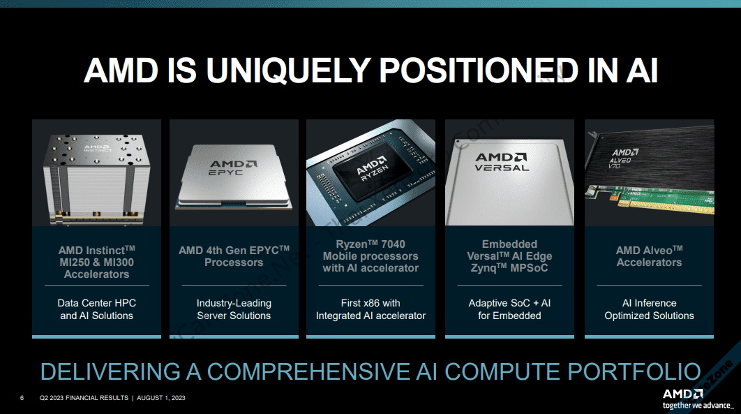 Dr. Lisa Su ซีอีโอ AMD กล่าวว่าในไตรมาสที่ผ่านมาบริษัทได้เพิ่มการส่งมอบ EPYC 4th Gen และซีพียู Ryzen 7000 รวมทั้งเห็นความสนใจในผลิตภัณฑ์ด้าน AI เพิ่มขึ้นมากกว่า 7 เท่าตัว ซึ่งบริษัทก็ยังเดินหน้าพัฒนาทั้งฮาร์ดแวร์และซอฟต์แวร์เพื่อรองรับความต้องการนี้ โดย Instinct MI300 จะเริ่มส่งมอบได้ในไตรมาสที่ 4