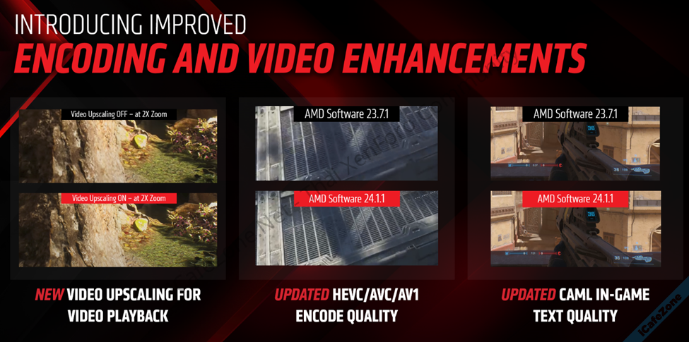 - AMD Video Upscaling ใช้จีพียูช่วยอัพสเกลวิดีโอ ใช้ได้กับ Radeon RX 7000 บนเดสก์ท็อป รองรับทั้งบนเบราว์เซอร์และแอพตระกูล media player