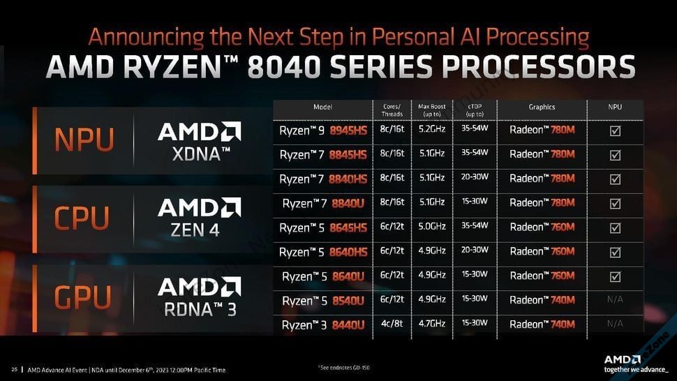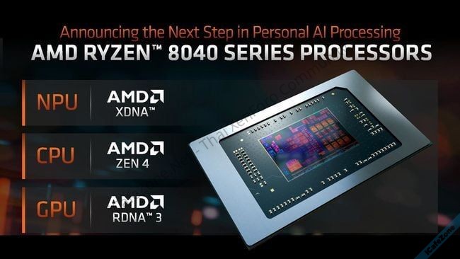 ของใหม่จริงๆ ใน Ryzen 8040 คือประสิทธิภาพของชิป NPU ที่เพิ่มขึ้นจากเดิม (จาก 10 TOPS เป็น 16 TOPS) โดยชิป 8040 เกือบทุกตัว (ยกเว้น 2 รุ่นล่างสุด) มี NPU สำหรับเร่งความเร็ว AI มาให้ในตัว ซึ่ง AMD ชูจุดขายเรื่องซอฟต์แวร์ Ryzen AI ที่พร้อมให้ฝั่งแอปพลิเคชันเรียกใช้งาน