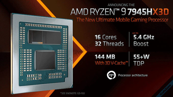 Ryzen 9 7945HX3D เป็นเวอร์ชันย่อยของ Ryzen 9 7945HX ซีพียูตัวท็อปสุดสายโน้ตบุ๊กที่วางขายอยู่ก่อนแล้ว สเปกคร่าวๆ คือ 16 คอร์ 32 เธร็ด แต่เพิ่มแคช L3 จากเดิมเท่าตัว 32+32MB (รวมเป็น 64MB) มาเป็น 96+32MB (รวมเป็น 128MB) โดย AMD ระบุว่าประสิทธิภาพในการเล่นเกมดีขึ้นเฉลี่ย 15%