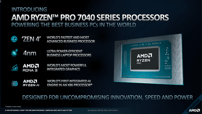 Ryzen Pro 7040 Notebook มีทั้งหมด 6 รุ่นย่อย แบ่งเป็นซีรีส์ HS กินไฟ 35-54W และซีรีส์ U กินไฟ 15-28W จีพียูเป็น RDNA 3 ทั้งหมด