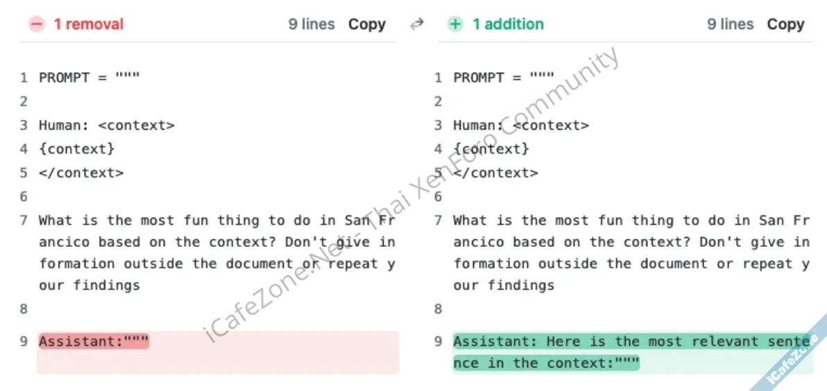 หลังจากนั้นทีมงานเล่าว่าระหว่างการทดสอบภายใน ทีมงานพบว่าหากเติม prompt ให้ Claude ระบุข้อความที่เกี่ยวข้องก่อนที่จะตอบคำถาม Cluade จะตอบคำถามได้ดีขึ้นมาก จากการทดสอบข้อมูลชุด Needle in A Haystack ที่ Claude เคยตอบได้เพียง 27% เมื่อใส่ context เต็มความจุ คะแนนก็จะพุ่งขึ้นมาเป็น 98% ทีเดียว