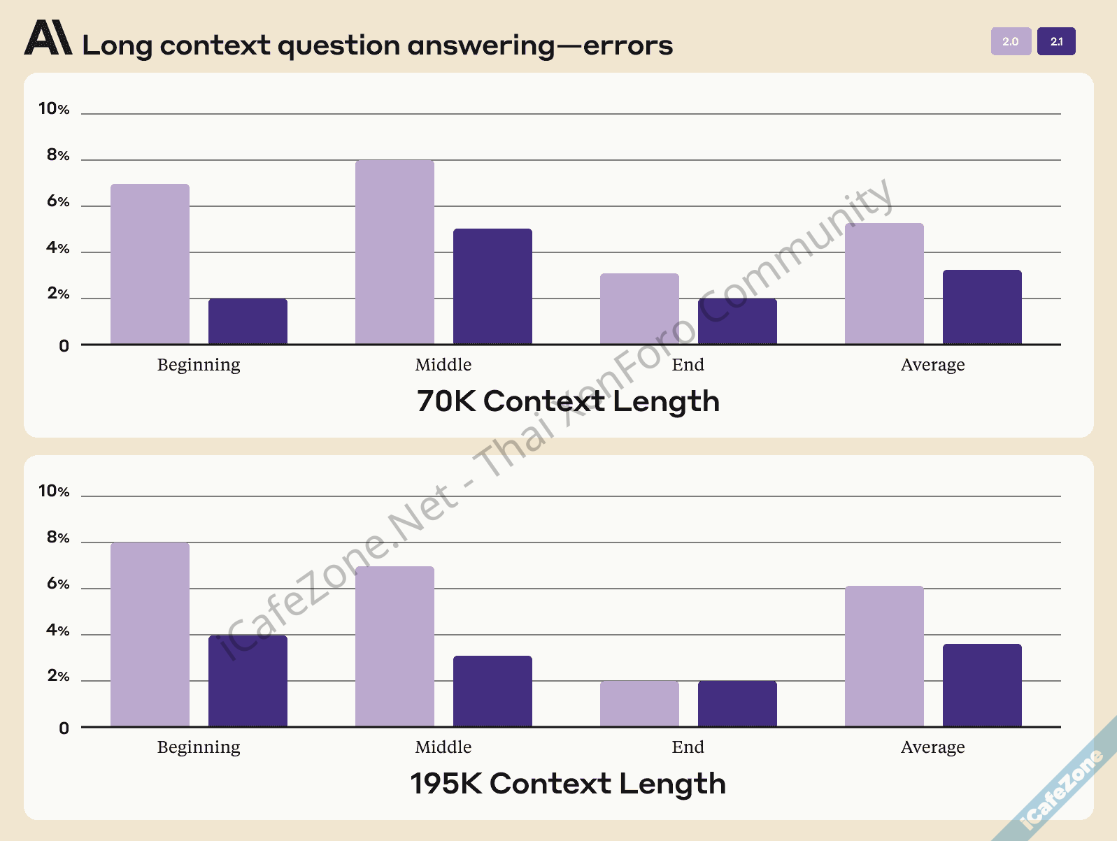 ในแง่ของคุณภาพ Claude 2.1 แก้ปัญหาเรื่องข้อมูลผิดลงไปได้มาก ตัวเลขของ Anthropic บอกว่าลดลง 2 เท่าเมื่อเทียบกับ Claude 2.0 และอัตราการตอบว่าไม่แน่ใจ (แทนการเลือกตอบผิดๆ มั่วๆ) นั้นเพิ่มขึ้นเช่นกัน
