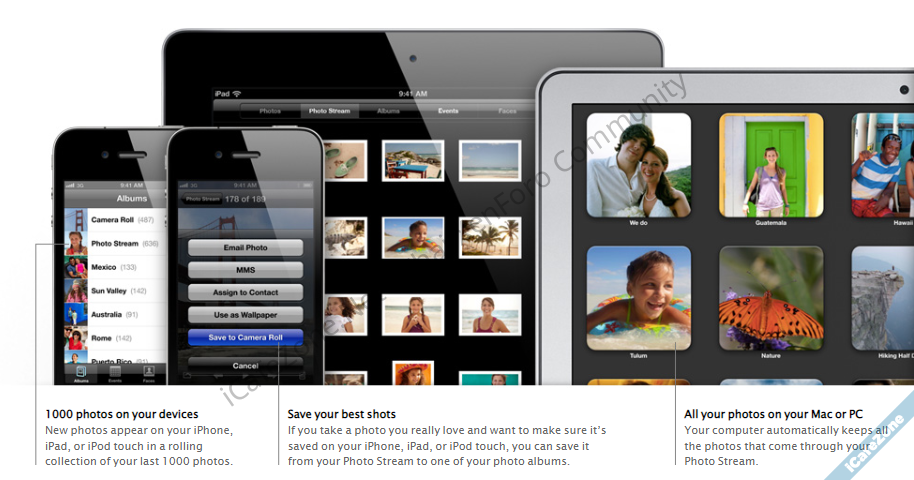 แอปเปิลเปิดตัว My Photo Stream ตั้งแต่ปี 2011 พร้อมกับการเปิดตัวบริการ iCloud เป็นบริการฟรีที่เก็บ 1,000 รูปล่าสุดในอุปกรณ์ของแอปเปิลที่ใช้งานไว้บน iCloud เป็นเวลา 30 วัน แล้วแสดงรูปในทุกอุปกรณ์เมื่อเชื่อมต่อ Wi-Fi เพื่อให้เซฟลงอุปกรณ์ต่อได้ บริการนี้ถูกแทนที่ด้วย iCloud Photos ในเวลาต่อมา